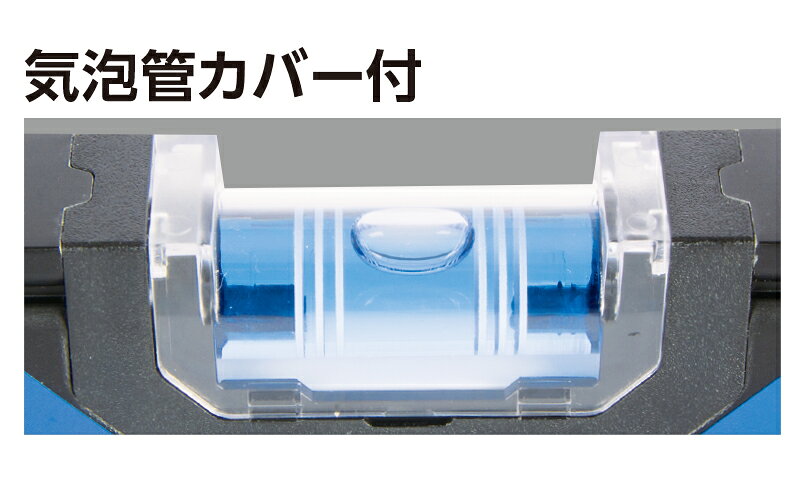 ●傷や汚れを防ぐ気泡管カバー付です。 ※本体は防水構造ではありません。 ●クリアブルーの溶液とホワイトラインで 視認性の高い気泡管を採用しました。 ※気泡管の目盛で勾配は測定できません。 ●強力なヨーク付きマグネットで、鉄骨工事に便利です。 ●垂直気泡管付です。 ●ボックス型でケガキやすい形状です。 ●測定面はV字型溝付でパイプ測定もできます。 ・仕様 ●本体サイズ 1,200×52×20mm ●製品質量 670g ●感度 0.5mm/m=0.0286° ●精度 ±2.5mm/m=±0.1432°以内 ●材質 本体:アルミ、ABS樹脂、 ポリカーボネート樹脂 気泡管:アクリル樹脂 液体:石油系液