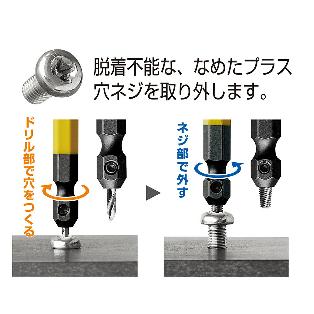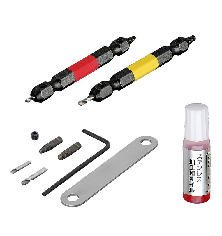 No. ANH-S2 対応ネジサイズ M2.5〜5ネジ セット内容 ●M2.5〜3ネジ対応ビット(全長65mm) ●M3.5〜5ネジ対応ビット(全長65mm) ●ステンレス加工用オイル ●スペアドリル部品 1.5mm, 2mm(各1ヶ) ●スペアネジ部品 No.1用, No.2用(各1ヶ) ●専用レンチ、専用スパナ、固定用ネジ(各1ヶ) 製品特長 ●電動ドライバーを使用してなめたネジを外します ●ステンレスネジにも対応(SUS304など) ●スペアドリル部品、スペアネジ部品付 RoHS2対応 〇 注意事項 ドリルネジ、コーススレッド、タッピングネジ、六角穴付ボルトなど熱処理したネジ(HRC40以上)は穴あけが難しいため使用できません。 この商品は、ネコポスでの配送が可能です。 ご注文の総量がネコポス規定を超える場合は宅配便に変更させていただきます。変更になる場合はご注文内容確認メールでご連絡いたしますので、必ずご確認下さい。 また、ネコポス配送をご希望の場合は必ず配送について 「ネコポス」をご確認ください。■ 各種製品紹介 ■