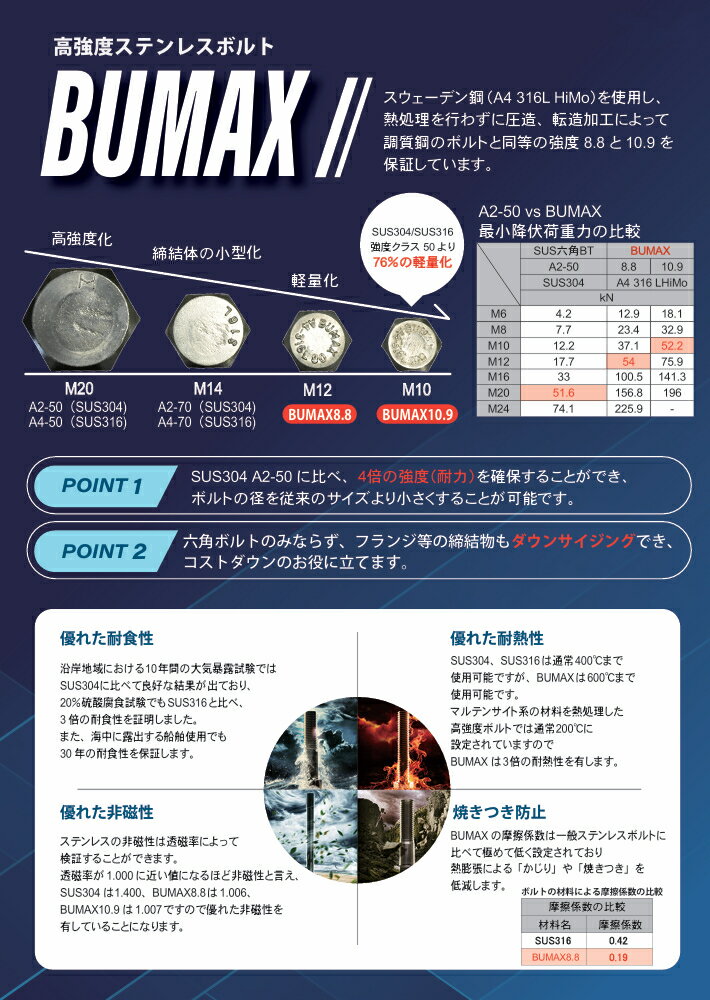 入数違い商品入数:1本10本100本注意事項★-- ねじ等の各種画像についての注意事項 --★・ 形状は同等ですが、サイズ、ピッチ、ねじ部の長さは異なります。・ 刻印はサイズによって異なり、予告なく変更される場合があります。・ ディスプレイの違いにより、実際の色合いと異なる場合があります。● 同一材質/表面処理商品 サイズ表本商品の材質/表面処理と同じ商品のサイズ表を表示します。● 同一形状商品 サイズ表形状が同じ関連商品のサイズ表を表示します。 例えば、同じ形状で他の材質/表面処理などのサイズ表を確認できます。ネコポスでの配送が可能です。ご注文の総量がネコポスの取り扱い規定サイズを超える場合は宅配便に変更させていただきます。変更になる場合はご注文内容確認メールでご連絡いたしますので、必ずご確認下さい。また、ネコポス配送をご希望の場合は必ず配送について 「ネコポス」をご確認ください。ステンレス(BUMAX 88)/生地 キャップボルト (半ねじ)M6×45 【 バラ売り : 1本入り 】注)写真はイメージです! 刻印、ねじ部の長さ、ピッチなどは、サイズによって異なります。刻印はメーカーによって予告なく変更される場合があります。 頭部形状 キャップ六角穴が開いた円筒形の頭部です。締め付けには六角レンチを使用するため、強いトルクをかけて締結することができます。 材 質 ステンレス(BUMAX 88)ステンレス鋼でありながら、強度は鋼製品の強度区分 8.8と同等。 耐食性はSUS316の3倍。 耐熱性は600度を保証。 ボルト締付け時の摩擦係数はSUS316の50%以下。 まさに最強のステンレス! 表面処理 (メッキ) 生地 表面処理/メッキは、何も施していない状態です。そのため、耐食性や見た目は、材質そのものの特性および色合いとなります。注)上記「材質」、「表面処理」画像は、厳密な色合いが表現できません。イメージ程度でご覧ください。 ねじ部形状 半ねじ 並目ISO(国際標準化機構)規格で規定された、国内で一番標準的なピッチで、流通量が多い規格です。また、「半ねじ」とは ねじ先から途中までしか、ねじ山が切られていない形状です。 ねじ山が切ってある部分の長さは、メーカー、サイズなどによって異なります。 1.0 mm サイズ M6 × 45[太さ] × [長さ]「太さ」、「長さ」共に ミリメートル(mm)単位で表します。 「太さ」の先頭に "M" が付きます。 45 mm約5 mm6 mm( M6 )工具はこちらから選択 ⇒注)写真はイメージです! 刻印、ねじ部の長さ、ピッチなどは、サイズによって異なります。■ 本形状のネジは、こんなところで使用されていることがあります。 一般機械、工作機械、土木建築機械、各種産業機械、各種装置の組み立てやカバーなどの各種部品の取付け。注)使用用途に応じた 「強度」、「材質」、「ネジ部形状」 の商品をお選びください。