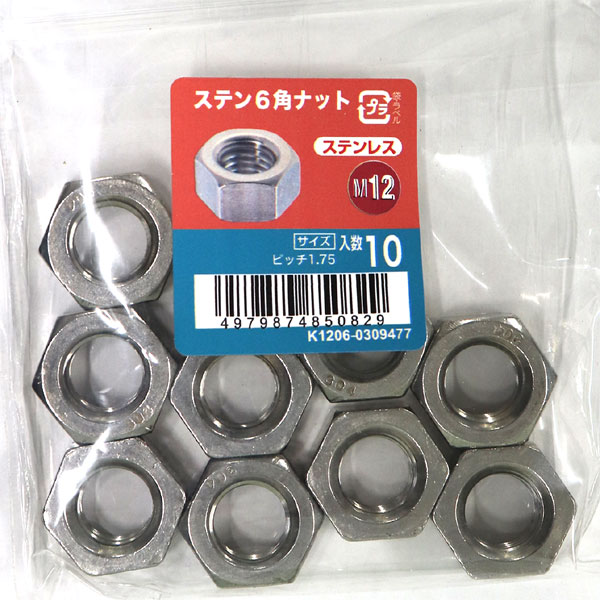 入数違い商品入数:10個100個1000個注意事項★-- ねじ等の各種画像についての注意事項 --★・ 形状は同等ですが、サイズ、ピッチ、ねじ部の長さは異なります。・ 刻印はサイズによって異なり、予告なく変更される場合があります。・ ディスプレイの違いにより、実際の色合いと異なる場合があります。● 同一材質/表面処理商品 サイズ表本商品の材質/表面処理と同じ商品のサイズ表を表示します。● 同一形状商品 サイズ表形状が同じ関連商品のサイズ表を表示します。 例えば、同じ形状で他の材質/表面処理などのサイズ表を確認できます。● 同一サイズの材質/表面処理違い商品同一サイズには、他に以下の材質/表面処理があります。・ 鉄/生地・ 鉄/ユニクロ・ 鉄/クロメート(黄褐色メッキ)・ 鉄/黒色クロメート・ 鉄/三価ホワイト・ 鉄/茶ブロンズ (GB)・ 鉄/ニッケル・ 鉄/クローム・ 鉄/ドブ・ 鉄/パーカー・ 鉄(S45C)/生地・ 鉄(S45C)/ユニクロ・ ステンレス/生地・ ステンレス/SSブラック・ ステンレス/茶ブロンズ (GB6号)・ ステンレス/焼き付き防止などのコーティング・ SUS316/生地・ SUS316L/生地・ 純チタン/生地・ 低カドミウム黄銅/生地・ 低カドミウム黄銅/ニッケルネコポスでの配送が可能です。ご注文の総量がネコポスの取り扱い規定サイズを超える場合は宅配便に変更させていただきます。変更になる場合はご注文内容確認メールでご連絡いたしますので、必ずご確認下さい。また、ネコポス配送をご希望の場合は必ず配送について 「ネコポス」をご確認ください。鉄/三価ブラック 袋ナットM6 【 バラ売り : 10個入り 】注)写真はイメージです! 刻印、ねじ部の長さ、ピッチなどは、サイズによって異なります。刻印はメーカーによって予告なく変更される場合があります。 特 長 締結後、袋のキャップ部分が見栄えを良くしたり、安全面を求めるところに使用することが多い商品です。表面を覆っているため、通称「化粧ナット」とも呼ばれます。基本的には、キャップ部分を2種の六角ナットに溶接した「3形2種」ですがサイズによって異なりますので、この規格が重要な場合にはお問合せください。 形 状 袋ナット六角ナットの片面に、ドーム形の金属が被さったナット。ねじ穴よりボルトなどのねじ部が露出しないため、見た目も良く安全性も向上します。スパナ、レンチなどの工具を使用して締め付けます。 材 質 鉄「鉄」 とは 「鋼」 であり、炭素を含んだ鉄の合金です。一般的に多く流通していて、安価な材質ですが、錆びやすいという欠点があるため、多くは表面処理により腐食を抑えます。 表面処理 (メッキ) 三価ブラック ※ 商品の色合いとなります。「黒色クロメート」と同等の耐食性をもち、擬似的な自己修復性ももちます。六価クロムと異なり無害で、RoHS指令にも対応しています。 そのため、黒色クロメートの代替として使用されます。色合いは、「黒色」 です。注)上記「材質」、「表面処理」画像は、厳密な色合いが表現できません。イメージ程度でご覧ください。 ねじ部形状 並目ISO(国際標準化機構)規格で規定された、国内で一番標準的なピッチで、流通量が多い規格です。 1.0 mm サイズ M6[太さ]「太さ」は ミリメートル(mm)単位で表します。 「太さ」の先頭に "M" が付きます。 6 mm( M6 )工具はこちらから選択 ⇒注)写真はイメージです! 刻印、ねじ部の長さ、ピッチなどは、サイズによって異なります。