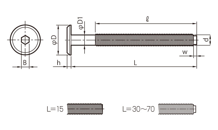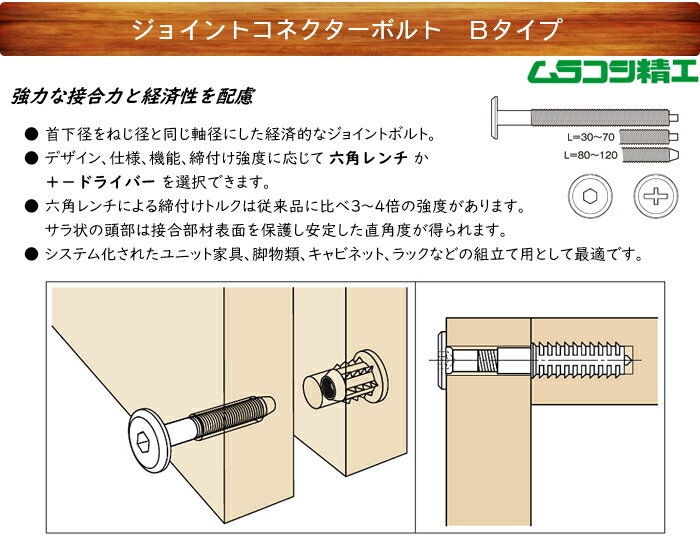 注意事項★ ネジの実写画像についての注意事項 ・ ねじの形状は同等ですが、サイズ、ピッチ、ねじ部の長さは異なります。 ・ 刻印はサイズによって異なり、予告なく変更される場合があります。 ・ ディスプレイの違いにより、実際の色合いと異なる場合があります。関連商品 ★ お得セット (50本) ここをクリック!★ 小箱売り (200本) ここをクリック!その他のサイズ 当商品のサイズ違いは、下の「サイズ表」より参照してください。 ★ サイズ表 ここをクリック!同一サイズの 材質/表面処理違い 当商品と同じサイズで、他の材質/表面処理には以下があります。 ・ 鉄/ニッケルこの商品は、ネコポスでの配送が可能です。ご注文の総量がネコポスの取り扱い規定サイズを超える場合は宅配便に変更させていただきます。変更になる場合はご注文内容確認メールでご連絡いたしますので、必ずご確認下さい。また、ネコポス配送をご希望の場合は必ず配送について 「ネコポス」をご確認ください。鉄/茶ブロンズ (GB) ジョイントコネクターボルト JCB-B (六角穴) [ムラコシ製]M6×30 【 バラ売り : 9本入り 】注)写真はイメージです! 刻印、ねじ部の長さ、ピッチなどは、サイズによって異なります。刻印はメーカーによって予告なく変更される場合があります。 特 長 JCB−BジョイントコネクターボルトBタイプ●ネジ径をM6に統一し、鬼目ナット類との互換性を追及しました。●首下径をねじ径と同一にした経済的製品です。 頭部形状 JCB組立て家具の部材と部材を接続する時に使用する、六角穴のあいた 「ジョイントコネクターボルト」。 雌ねじ側には、「ジョイントコネクターナット(JCN)」 や 「鬼目ナット」 などを使用します。 材 質 鉄「鉄」 とは 「鋼」 であり、炭素を含んだ鉄の合金です。一般的に多く流通していて、安価な材質ですが、錆びやすいという欠点があるため、多くは表面処理により腐食を抑えます。 表面処理 (メッキ) 茶ブロンズ (GB) ※ 商品の色合いとなります。Gはジャーマン、Bはブロンズまたはブラウンの略で、ドイツ軍の戦車の色という説もあります。 GBメッキは、下地に銅メッキを貼った後、特殊な薬品で色づけ研磨をします。色合いは、「ブロンズ色」 です。注)上記「材質」、「表面処理」画像は、厳密な色合いが表現できません。イメージ程度でご覧ください。 ねじ部形状 並目ISO(国際標準化機構)規格で規定された、国内で一番標準的なピッチです。 国内で一番流通量が多い。 1.0 mm サイズ M6 × 30[太さ] × [長さ]「太さ」、「長さ」共に ミリメートル(mm)単位で表します。 「太さ」の先頭に "M" が付きます。 30 mm4 mm6 mm( M6 )工具はこちらから選択 ⇒■ 本形状のネジは、こんなところで使用されていることがあります。 家具材の締結に使用します。注)使用用途に応じた 「強度」、「材質」、「ネジ部形状」 の商品をお選びください。