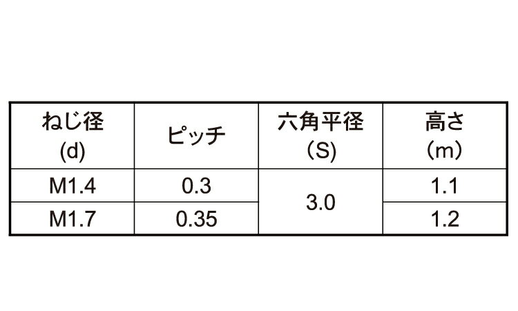 入数違い商品入数:10個100個注意事項★-- ねじ等の各種画像についての注意事項 --★・ 形状は同等ですが、サイズ、ピッチ、ねじ部の長さは異なります。・ 刻印はサイズによって異なり、予告なく変更される場合があります。・ ディスプレイの違いにより、実際の色合いと異なる場合があります。● 同一材質/表面処理商品 サイズ表本商品の材質/表面処理と同じ商品のサイズ表を表示します。● 同一形状商品 サイズ表形状が同じ関連商品のサイズ表を表示します。 例えば、同じ形状で他の材質/表面処理などのサイズ表を確認できます。● 同一サイズの材質/表面処理違い商品同一サイズには、他に以下の材質/表面処理があります。・ 鉄/黒色クロメート・ 鉄/三価ブラック・ 鉄/ニッケル・ ステンレス/生地ネコポスでの配送が可能です。ご注文の総量がネコポスの取り扱い規定サイズを超える場合は宅配便に変更させていただきます。変更になる場合はご注文内容確認メールでご連絡いたしますので、必ずご確認下さい。また、ネコポス配送をご希望の場合は必ず配送について 「ネコポス」をご確認ください。鉄/三価ホワイト 極小 六角ナットM1.4 【 バラ売り : 10個入り 】注)写真はイメージです! 刻印、ねじ部の長さ、ピッチなどは、サイズによって異なります。刻印はメーカーによって予告なく変更される場合があります。 形 状 六角ナット(両面面取り)両面面取りされた六角ナットです。六角ナット[2種]がこの形状になります。両面面取りされているため、どちらを上にしても、見た目、安全性に問題はありません。 スパナ、レンチなどの工具を使用して締め付けます。 材 質 鉄「鉄」 とは 「鋼」 であり、炭素を含んだ鉄の合金です。一般的に多く流通していて、安価な材質ですが、錆びやすいという欠点があるため、多くは表面処理により腐食を抑えます。 表面処理 (メッキ) 三価ホワイト ※ 商品の色合いとなります。「クロメート」と同等の耐食性をもち、擬似的な自己修復性ももちます。六価クロムと異なり無害で、RoHS指令にも対応しています。 そのため、ユニクロ/クロメートの代替として使用されます。色合いは、「シルバー色」 です。注)上記「材質」、「表面処理」画像は、厳密な色合いが表現できません。イメージ程度でご覧ください。 ねじ部形状 並目ISO(国際標準化機構)規格で規定された、国内で一番標準的なピッチで、流通量が多い規格です。 0.3 mm サイズ M1.4[太さ]「太さ」は ミリメートル(mm)単位で表します。 「太さ」の先頭に "M" が付きます。 1.4 mm( M1.4 )工具はこちらから選択 ⇒■ 本形状のネジは、こんなところで使用されていることがあります。 小ねじ、ボルトなどと組み合わせて使用。 一般機械、工作機械、土木建築機械、各種産業機械、精密機械、各種装置の組み立てや各部品の取付け。自転車のブレーキ、かご、サドル、ハブ軸の取付け。その他にも橋、船、自動車、電車、配管、家具、キャンプ用テーブル、ラジコンなどで使用。注)使用用途に応じた 「強度」、「材質」、「ネジ部形状」 の商品をお選びください。