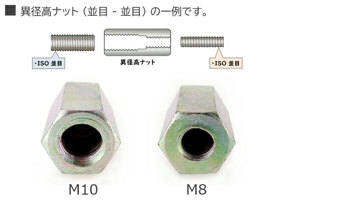 注意事項★ ネジの実写画像についての注意事項 ・ 画像は、基本的に白黒 or メッキなしの画像です。 ・ ねじの形状は同等ですが、サイズ、ピッチ、ねじ部の長さは異なります。 ・ 刻印はサイズによって異なったり、予告なく変更される場合があります。 ・ 色合いなどは、「表面処理 色合いイメージ画像」でイメージしてください。関連商品 ★ お得セット (10本) ここをクリック!★ 小箱売り (90本) ここをクリック!その他のサイズ 当商品のサイズ違いは、下の「サイズ表」より参照してください。 ★ サイズ表 ここをクリック!同一サイズの 材質/表面処理違い 当商品と同じサイズで、他の材質/表面処理には以下があります。 ・ 鉄/三価ホワイトこの商品は、ネコポスでの配送が可能です。ご注文の総量がネコポスの取り扱い規定サイズを超える場合は宅配便に変更させていただきます。変更になる場合はご注文内容確認メールでご連絡いたしますので、必ずご確認下さい。また、ネコポス配送をご希望の場合は必ず配送について 「ネコポス」をご確認ください。鉄/生地 異径高ナット (並目-並目)M6 - M8×50 【 バラ売り : 1本入り 】 形 状 高ナット六角ナットの高さが高くなったナット。 「長ナット」、「スペーサーナット」とも呼ばれます。 高ナットは 商品によって、全てねじ山が切ってある(全ねじ)や、両端にだけねじ山が切ってあり、中央にはねじ山が切ってない(両ねじ)が存在します。スパナ、レンチなどの工具を使用して締め付けます。 材 質 鉄「鉄」 とは 「鋼」 であり、炭素を含んだ鉄の合金です。一般的に多く流通していて、安価な材質ですが、錆びやすいという欠点があるため、多くは表面処理により腐食を抑えます。 表面処理 (メッキ) 生地 表面処理/メッキは、何も施していない状態です。そのため、耐食性や見た目は、材質そのものの特性および色合いとなります。注)上記「材質」、「表面処理」画像は、厳密な色合いが表現できません。イメージ程度でご覧ください。 ねじ部形状 両端異径(M-M)高ナット(長ナット)の両側のねじ穴の「呼び径」が異なる形状です。 例えば、片方が「M8の並目」で、もう片方が「M10の並目」 になった形状。 1.0 mm1.25 mm サイズ M6 - M8 × 50[太さ1] - [太さ2] × [長さ]「太さ1」、「太さ2」、「長さ」共に ミリメートル(mm)単位で表します。 「太さ1」、「太さ2」の先頭に "M" が付きます。 50 mm 6 mm( M6 )8 mm( M8 )■ 本形状のネジは、こんなところで使用されていることがあります。 太さの異なる寸切ボルトや各種ボルトとの繋ぎ目として、異径高ナットを使用することが多いと言われています。注)使用用途に応じた 「強度」、「材質」、「ネジ部形状」 の商品をお選びください。