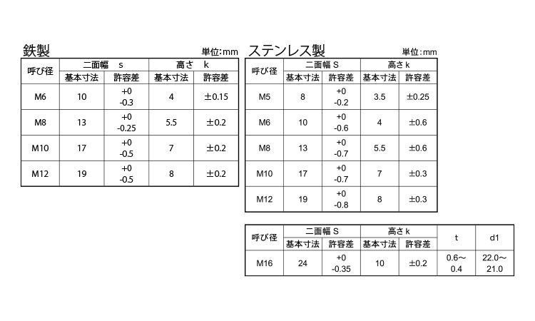 注意事項★ ネジの実写画像についての注意事項 ・ ねじの形状は同等ですが、サイズ、ピッチ、ねじ部の長さは異なります。 ・ 刻印はサイズによって異なり、予告なく変更される場合があります。 ・ ディスプレイの違いにより、実際の色合いと異なる場合があります。関連商品 ★ バラ売り (2本) ここをクリック!★ 小箱売り (200本) ここをクリック!その他のサイズ 当商品のサイズ違いは、下の「サイズ表」より参照してください。 ★ サイズ表 ここをクリック!この商品は、ネコポスでの配送が可能です。ご注文の総量がネコポスの取り扱い規定サイズを超える場合は宅配便に変更させていただきます。変更になる場合はご注文内容確認メールでご連絡いたしますので、必ずご確認下さい。また、ネコポス配送をご希望の場合は必ず配送について 「ネコポス」をご確認ください。ステンレス/生地 四角ボルト (全ねじ)M8×22 【 お得セット : 20本入り 】注)写真はイメージです! 刻印、ねじ部の長さ、ピッチなどは、サイズによって異なります。刻印はメーカーによって予告なく変更される場合があります。 頭部形状 四角ボルト頭部が四角形のボルトです。締結する時には、取付け部材や金具に設けた溝などに四角ボルトの頭部を挟んで、ボルトの回り止めをします。 これで、ボルト側を押さえることなく、めねじ側となるナットなどを回して締結します。 材 質 ステンレス最も代表的なステンレス鋼(SUS304相当)です。強度は「鉄」とほぼ同等程度です。耐食性に優れていて、機械的性質も良好です。通常磁性はないが、冷間加工によって硬化し、磁性が発生することもあります。 表面処理 (メッキ) 生地 表面処理/メッキは、何も施していない状態です。そのため、耐食性や見た目は、材質そのものの特性および色合いとなります。注)上記「材質」、「表面処理」画像は、厳密な色合いが表現できません。イメージ程度でご覧ください。 ねじ部形状 全ねじ 並目ISO(国際標準化機構)規格で規定された、国内で一番標準的なピッチです。 国内で一番流通量が多い。また、「全ねじ」とは ねじ先から頭部座面直下まで、全てねじ山が切ってある形状です。 1.25 mm サイズ M8 × 22[太さ] × [長さ]「太さ」、「長さ」共に ミリメートル(mm)単位で表します。 「太さ」の先頭に "M" が付きます。 22 mm 8 mm( M8 )