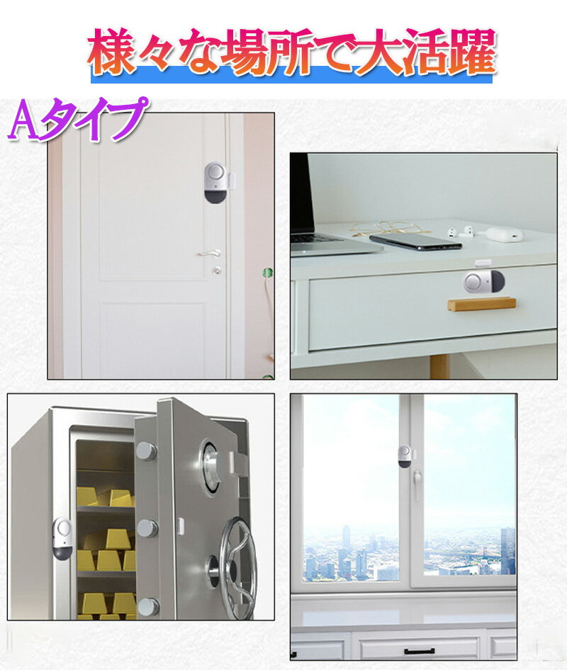 商 品 説 明 『窓・ドアの振動感知!防犯アラーム』 ◎小型でも大音量!しっかり警告◎ 心無い犯罪が多発しています。対策していますか? ・空き巣だけでなく家にいるのに大胆に侵入しようとする犯罪 ・2階にいる間に1階から侵入、またはその反対 ・家だけでなく会社や倉庫を狙った強盗 ・赤ちゃんや小さいお子様のよきせぬ窓の開閉 等々、思っていた以上に危険はいっぱいです。 小型で取り付けも簡単なので、ぜひ何か起きてしまう前に対策をすることをお勧めします。 大音量アラーム 小型サイズですが、最大120dbの大きさで周囲に鳴り響き、赤く点滅します。2階など離れた部屋からでも聞こえるので、安心してご利用いただけます。 少しの隙間で警報 親機と子機が約1.5cm以上離れるとアラームが鳴る仕様になっています。人が通れない隙間でしっかり反応する大変便利な機能です。 一つでも不安な場所を解消 玄関、リビング、寝室等様々な場所に設置可能な商品です。設置後も電池交換が可能で、末永く防犯アラームとして活躍してくれます。 【簡単貼るだけ設置】 強力なパワーのシールでしっかり貼り付けられます。強力なので、貼り間違いにご注意を。人気関連商品こちら👇