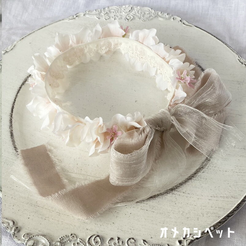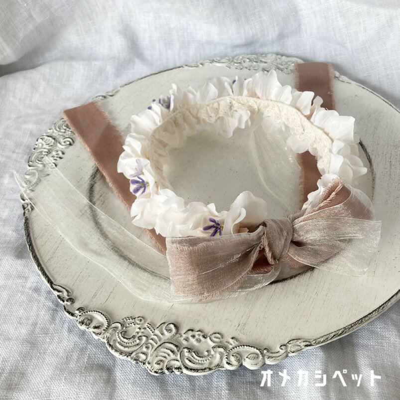 花冠 犬 帽子 飾り 小型犬 りぼん 中型犬 結婚式 誕生日 犬服 頭飾り 【3サイズ くすみリボン花冠り】 dog pet 猫 ねこ リングドッグ ヘアアクセサリー パピー 仔犬 かわいい 結婚式 誕生日 撮影会 チワワ プードル ミニチュアダックスフンド お花畑 犬グッズ オメカシペット ミルクベースのシンプルなお花とリボンのはなかんむり。上品な花冠です。選べるパーツで簡単に装着可能。お誕生日や結婚式のリングドッグ・おそろいギフトにも。 ミルキーなあじさいのシンプルな花冠に、小花を混ぜました。花部分はシンプルに、リボンに存在感を出しました。くすみリボンは国産コットンリネンリボンです。クシュクシュ加工のシフォンリボンとダブルリボン仕様です。大きなリボンが可愛らしい花かんむりです。コードストッパー付きゴム:約20cm首にゴムを通して花冠を安定して装着出来ます。ゴムが長い場合はストッパー下の垂れる部分をカットしてご利用下さい。レース:お好きな長さに結んでください。Sサイズ:花部分全長:20cmMサイズ:花部分全長:28cmLサイズ:花部分全長:35cm取れにくく実用的ですので、撮影用としてだけではなく、記念日やお出かけなどにもお使い頂けます。<取り扱い注意事項>- お花は染料が落ちる事があるため、水濡れにはご注意ください。- 直射日光や高温多湿の場所に長時間放置しないでください。- サイズに合わせて正確に装着してください。装着が緩くなったり、壊れたパーツがある場合は、危険なので使用しないでください。【関連カテゴリー】ペットアクセサリー ドッグアクセサリー ドッグチョーカー わんこ撮影会 猫 ねこ 兎 ウサギ ペットアクセサリー ペット花冠 ペット用はなかんむり おうちフォト ペットフォト フォトスタジオ フォトグラファー うちの子記念日 犬用 猫用 ウサギ用 2