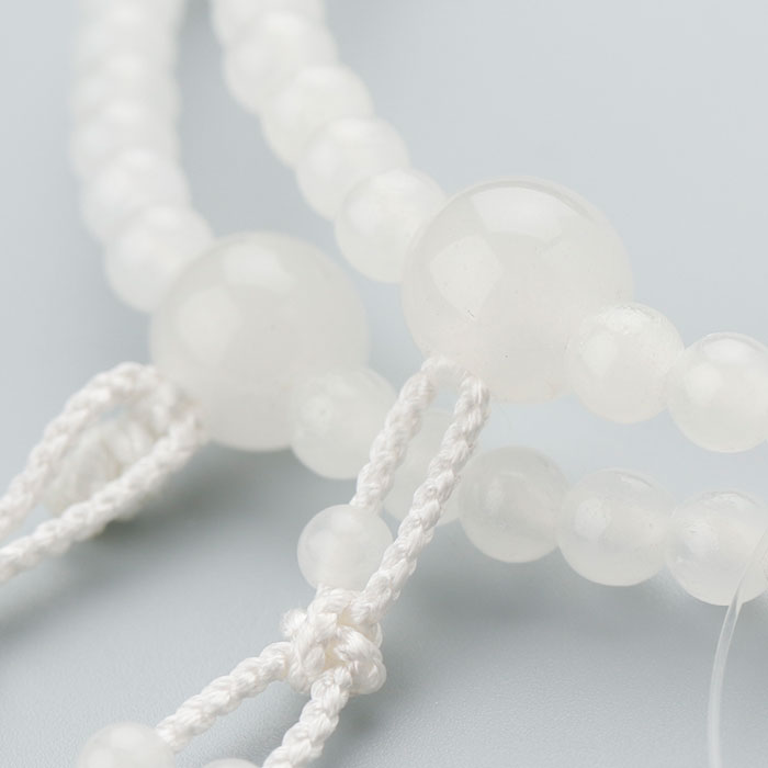 コメント 真言宗、女性用の正式なお数珠でございます。素材は、清らかな白の輝きが美しい白オニキスでございます。玉のひとつひとつが滑らかに磨き上げられており、手に馴染む上質な仕上がり。清楚で上品な佇まいは、年齢や宗派を問わずご愛用頂けます。房は、丈夫で扱い易く、型崩れを起こさない小田巻梵天房を採用させて頂いております。この他にも、真言宗・女性用のお数珠、多数ご準備ございます。 サイズ 8寸サイズ 素材 親玉:白オニキス(約10ミリ) 主玉:白オニキス(約5ミリ) 天玉:白オニキス(約4ミリ) 石の効力 ◆オニキス 「悪霊から身を守る石」とされ、肉体の内側にある本能を目覚めさせ、運動能力を刺激して向上させる力があると伝えられています。 房 正絹製・小田巻梵天房(白色) 付属品 高級桐箱 宗派 真言宗 備考欄 ※掲載写真はお届けの商品とイメージが異ならないよう、都度、細心の注意を払い更新しております。この商品は模様・色合い等に変化が少ない為、現品写真ではございません。 ※現品写真ご希望のお客様は「現品写真メールサービス」をご利用下さい。