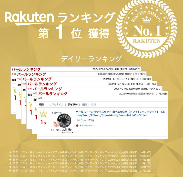 【商品説明】 使いやすい6サイズをお得なセットに! ケース入りなので、使い終わったらそのまま収納出来ます。 形状:半球タイプ カラー:ホワイト/オフホワイト からご選択頂けます ケースサイズ:直径6cm パールサイズ: 1.5mm/2mm/2.5mm/3mm/4mm/5mm 【配送方法】 ネコポス可 関連商品球体パール サイズMIX 通し穴無しのパールストーン全6色 ジェル ネ...樹脂リボンパーツ 6色 5個入り ネイルパーツ 3Dパーツ ネイルジュ...オーロラクリアリボンパーツ ピンク 5個入り ネイルパーツ 3Dパーツ...99円99円99円ネイルパーツ ゆる猫 2個入り キャット クロネコ 白猫 三毛猫 パー...ネイルホイル 金箔/銀箔 全4色 ゴールド・シルバー たっぷりケース...【在庫処分セール!】ユニコーンパウダー 全12色 ケース入り メタリッ...99円99円99円オーロラカラーのくまパーツ 5個入り ネイルパーツ ベア 3Dパーツ ...ゴールドフレームパール ネイルジュエリー パールストーン 上品パール ...メタルスタッズ 星型ミニスタッズ ゴールド ケース入り スタースタッズ...99円129円99円ネイルパーツ メタル猫パーツ 4個入り 猫 キャッツ ネイルアクセサリ...オーロラカラーの蝶パーツ プラパーツ 6色 5個 蝶 バタフライ ネイ...ネイルリボンパーツ全4種 10個入り シンプルリボン ゴールド/シルバ...99円99円99円