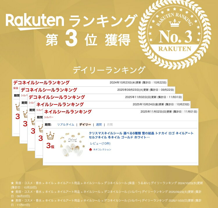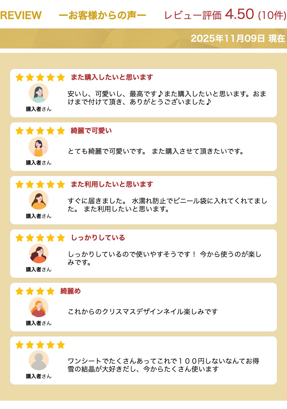 【商品説明】 難しい手書きアートの必要無し! 貼るだけで冬アートが完成♪利き手のネイルも簡単! 雪の結晶やトナカイ、クリスマスロゴ等 全6種 お好きな種類をご選択下さい。 ▲入荷ロットにより、カラーに多少の誤差が出る場合がございます。 ▲破れないよう、ピンセット等で優しく台紙から剥がしてください。 ▲お使いのパソコンまたはスマートフォンによって、画像のカラーと実際のカラーで誤差が生じる場合がございます。予めご了承下さい。 【使用方法】 未硬化ジェルをエタノールでしっかり拭き取ってから貼ると綺麗に密着します。 貼った後はシリコンペンやワイプ等で軽く抑えてからトップで仕上げてください。 【配送方法】 ネコポス可 関連商品ネイルシール ストロベリー 【HANVYI-405】 いちご ジェルネ...ひまわりのネイルシール サンフラワー 花 お花 フラワー 向日葵 ジェ...ハロウィンネイルシール かぼちゃ おばけ ハロウィーン 秋 ネイルステ...99円99円99円ネイルシール もみじ 選べる2種 紅葉 落ち葉 秋 ネイルステッカー...ネイルシール 千鳥柄 千鳥格子 ちどり柄 秋ネイル 冬ネイル 白黒 モ...ネイルシール アーガイル柄 ニット セーター 冬 赤 ベージュ...99円99円99円ネイルシール ハロウィン ロゴ かぼちゃ ハロウィーン 秋 ネイルステ...くすみドライフラワーのネイルシール ジェルネイル ネイルアート セルフ...毎年春に人気♪チューリップのネイルシール ネイルアート セルフネイル ...99円99円99円水彩風フラワーアートのネイルシール 花びら リーフ ジェルネイル ネイ...たんぽぽのネイルシール タンポポ お花 花 フラワー ジェルネイル ネ...桜のネイルシール チェリーブロッサム フラワー お花 花 ジェルネイル...99円99円99円