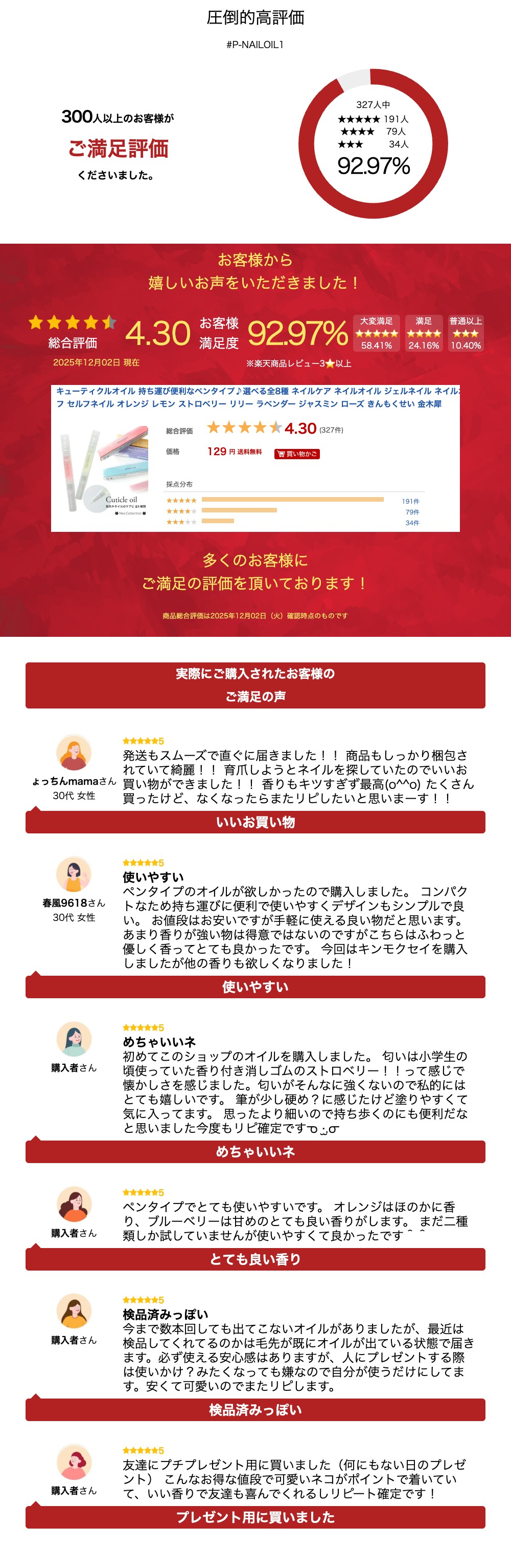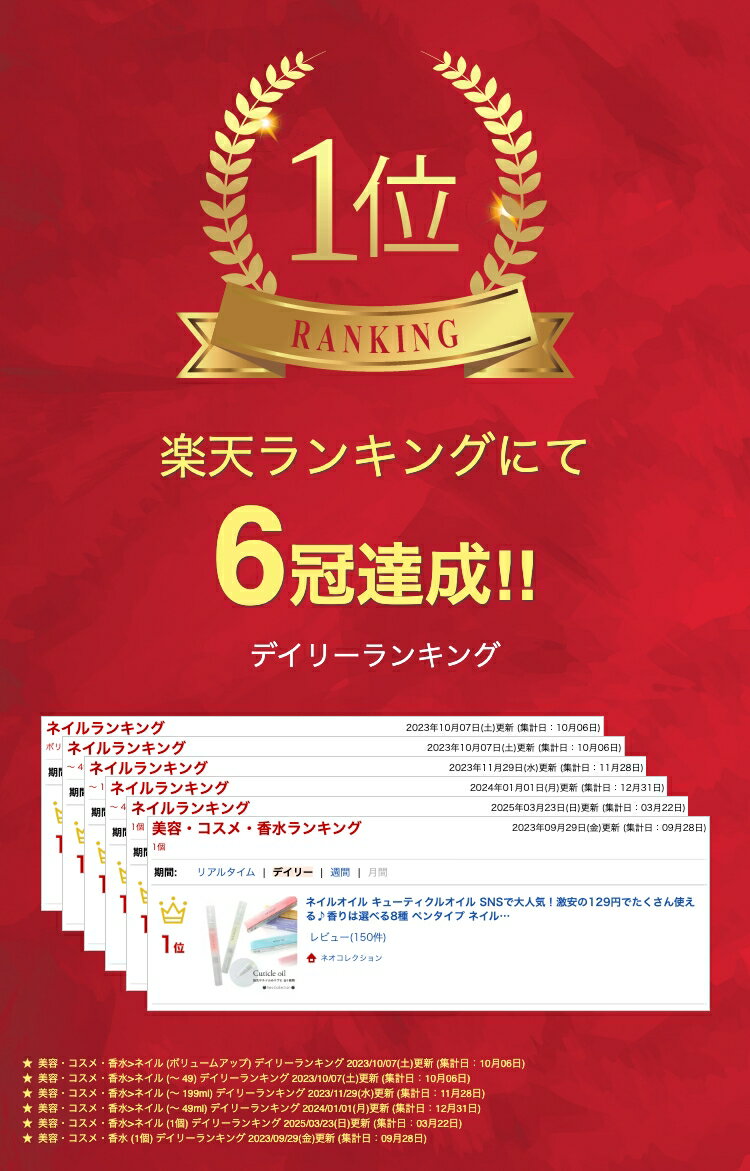 【商品説明】 【楽天ランキング1位受賞♪】 NEKOGEL(ネコジェル)キューティクルオイル 【商品説明】 コンパクトでいつでも使えるキューティクルオイルです♪ 指先を保湿し見た目も綺麗にネイルの持ちもup♪ せっかく綺麗にジェルネイルをしても、爪が乾燥してしまうと浮きの原因となります。 小まめにネイルオイルを塗ってあげる事で持ちが良くなります。 ちょっとしたプレゼントにも喜ばれます! 化粧品登録済み ○キューティクルオイルの特徴○ ・使いやすいペンタイプ ・高保湿でさらっとした付け心地 ・ほんのり香るネイルオイル ・SNSでも人気♪スタッフも愛用しています ○キューティクルオイルの香りの種類○ ・オレンジ ・レモン ・ストロベリー ・リリー ・ラベンダー ・ジャスミン ・ローズ ・キンモクセイ ○キューティクルオイルの使い方○ 筆先の反対側を1〜2回転するとネイルオイルが出てきます。爪や指先に塗ってご使用ください。 ※使い初めはネイルオイルが出にくくなっています。様子を見ながらオイルが出てくるまで少しずつ回転数を増やしてください。 ○ご注意○ ▲ジェルネイルの塗布前にご使用頂くと、ジェルが取れてしまう原因になるのでお控え下さい。 ▲メール便対応の商品となります。配送時に箱が潰れてしまう場合がございますが、不良品ではありません。 ▲メール便による箱潰れがご心配の方は宅急便をご選択下さい。 ▲検品の都合で、毛先が湿った状態で届く場合がございますが、未使用品になります。予めご了承お願いいたします。 ▲お子様の手の届かない所に保管して下さい。 ▲高温や直射日光を避けて保管してください。 ▲爪や皮膚に異常を感じた場合はすぐに使用を中止してください。 本体サイズ:約12.5cm 内容量:2ml 成分:ミネラルオイル、パルミチン酸エチルヘキシル、ミツロウ、メチルパラベン、香料、(+/-)赤2、赤102、黄4、青1、青205 【配送方法】 ネコポス可(オイルのみご購入の場合は20本まで) ※入りきらない場合、決済後でも宅急便へ配送方法変更になります。予めご了承ください。 広告文責:(有)ネオ 区分:化粧品 原産国:中国関連商品【8本セット】ネイルオイル キューティクルオイル SNSで大人気!激安...ひし形ネイルファイル 2本セット 100/180 ジェルオフやサンディ...ネイルパーツ オーロラカラー猫パーツ キャット 2個入り ネイルアクセ...999円126円129円貼るだけ簡単ニュアンスフレームのネイルシール フレーム ゴールド シル...ピンクゴールド メタルパーツセット 選べる2タイプ ジェルネイル ネイ...ピンセット ステンレス製 選べる2タイプ(ストレート/鷲口) ツイーザ...129円129円129円シリコンブラシ 2way ネイルツール シリコンペン スティック ミラ...ヤーン糸ネイルパーツ ゴールド&シルバー2色セット レジン封入にも ネ...優しいホワイトカラー♪スノーロフレーク ホログラム 全6色 ケース入り...128円128円123円マグネットネイル用♪マグネットスティック 選べる2タイプ キャッツアイ...オーロラマーブル転写ホイル 全2種 10枚入り 転写ホイルシート マー...薄型メタルパーツ 雪の結晶ミックス ネイルパーツ 冬ネイル スノウ...99円129円129円