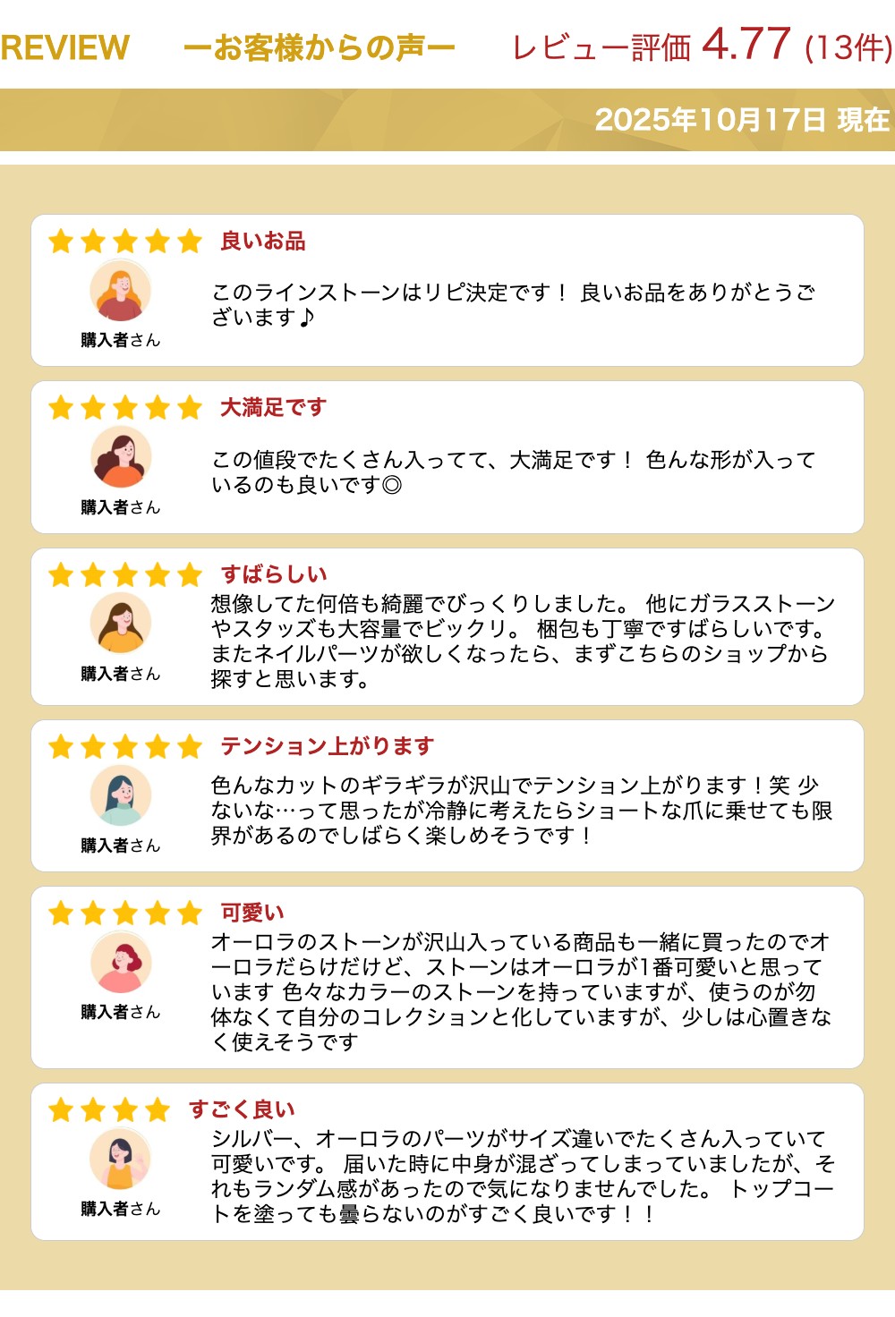 【商品説明】 ギラギラビジューセット 敷き詰めやポイント使いで、豪華な仕上がりに。 レジンやデコパーツとしても最適です。 各部屋に様々な形や大きさのパーツが入っています。 ▲入荷のロットにより、大きさに多少の誤差が生じる場合がございます。 ▲お使いのパソコンまたはスマートフォンによって、画像のカラーと実際のカラーで誤差が生じる場合がございます。予めご了承下さい。 ケースサイズ:直径約6.5cm/内径約5.4cm/厚み約1.2cm 【配送方法】 ネコポス可 関連商品ニュアンスパーツ ミックスセット 選べる6種のカラータイプ ジェルネイ...ラインストーンチェーン 2.0〜3.0mm幅 選べる4タイプクリスタル...ネイルビジュー クリスタルジュエリーパーツ 1個入り 全2種 レクタン...169円159円169円ビジューパーツ 4個セット ジェルネイル用パーツ ジェルネイル ネイル...ネイルビジュー クリスタルストーンパーツ 2個入り 全4種 ガラススト...ネイルパーツ オーロラカラー猫パーツ キャット 2個入り ネイルアクセ...129円159円129円猫のお顔のネイルシール 正面 キャット 動物 可愛い アニマル ねこ...ネイルビジュー スタークリスタルパーツ 1個入り 全2種 流れ星 クリ...ブリオン2色セット ケース入り ゴールド&シルバー ネイルパーツ メタ...159円199円199円ラインストーンチェーン 細めタイプ 選べる6タイプ クリスタルチェーン...メタルスタッズ カーブ ゴールド&シルバー各3サイズセット 6.4mm...海のメタルパーツ 6種セット メタルスタッズ ジェルネイル ネイルアー...129円199円199円