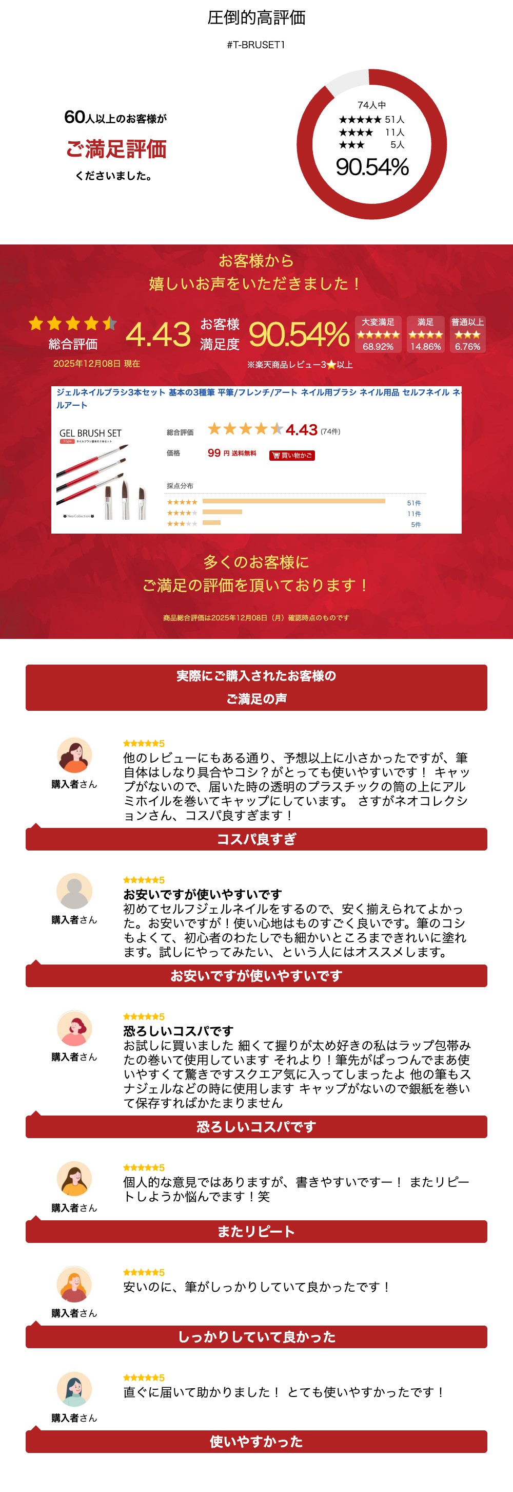 【商品説明】 まずはこの3本! フラット・・・ベースジェルやカラーのワンカラー等に使用する1番基本形 フレンチ・・・フレンチネイルやグラデーション等に アート・・・マーブルを作ったり、お花を書いたり、ニュアンスアート等、アートを描く際に ジェルネイル初心者の方や、お試しで筆を使って見たい方にピッタリです! ※ブラシキャップは付属しておりません。 ▲入荷ロットにより、筆先やサイズに多少の誤差が出る場合がございます。 ▲使用中、ライトの光が当たらないよう注意してご使用下さい。 ▲ジェルが付いたまま放置してしまうと固まってしまうので、使用後はしっかりとジェルを拭き取り、キャップをして保管をしてください。 ※キャップが無い場合はアルミホイルでも代用可能です。 ▲直射日光を避けて保管してください。 サイズ:フラット ブラシ部分約0.8cm/全長約18.2cm フレンチ ブラシ部分約1.0cm/全長約18.2cm アート ブラシ部分約1.5cm/全長約19cm 【使用方法】 ブラシにのりが付いているので、指先で軽くほぐし、ジェルクリーナーやエタノールなどでのりを取り除いてからご使用下さい。 【配送方法】 ネコポス可 関連商品ピンクゴールド 選べるジェルネイルブラシ 3タイプ ジェル用ブラシ 筆...ジェルネイルブラシ 選べる5種(ラインショート/ラインロング/オーバル...ブラシホルダー ブラシスタンド 便利アイテム 筆置き ネイル用品 セル...299円239円99円12部屋 パーツケース ラインストーンケース パーツ収納 ネイル レジ...セラミックプッシャー 簡単甘皮処理 キューティクルのサンディングにも ...キューティクルプッシャー メタルプッシャー 綺麗に甘皮処理が出来る! ...99円99円99円ブラックネイルファイル3本セット 180グリッド ジェルオフやネイル...ニッパーキャップ 肉球 ネイルニッパーケース キューティクルニッパー ...三角トレイ 3枚セット ラインストーン 細かいパーツの収納に ジェルネ...99円99円99円短めウッドスティック7.5cm10本セット オレンジスティック ネイル...ピンクカラーのアクリルブラシ スカルプ アクリル用 筆 3D エンボス...アクリル用ブラシ 3Dアートに最適 ネイルブラシ スカルプ エンボス ...99円799円299円