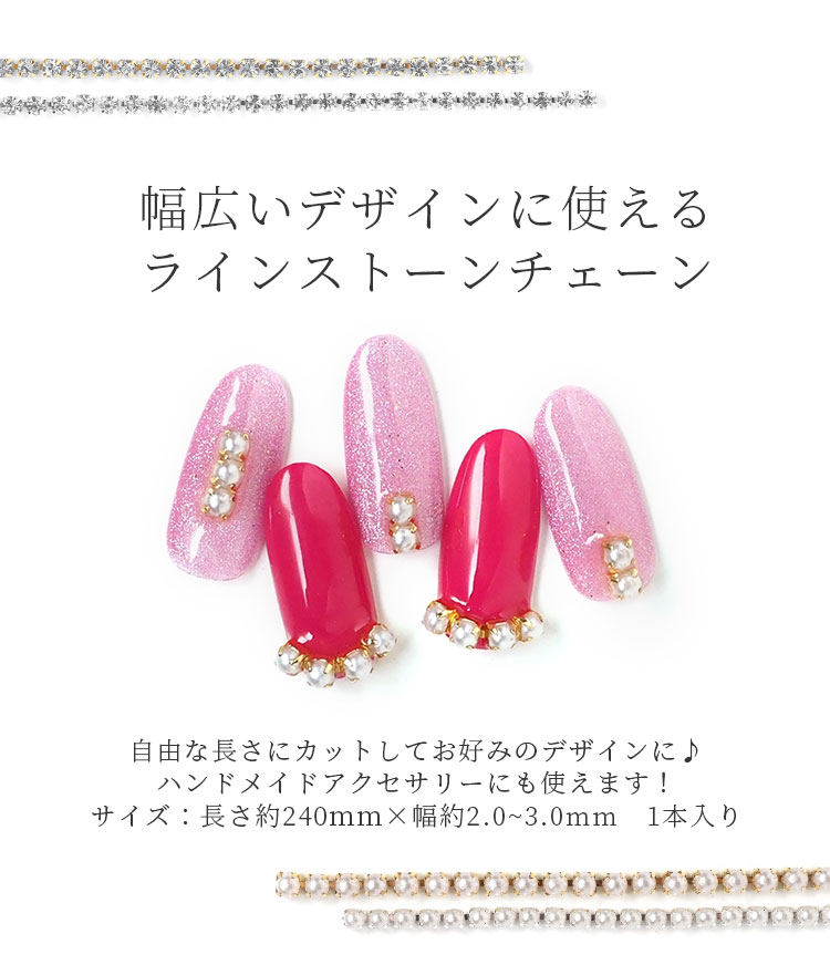 【商品説明】 ラインストーンチェーン 幅2.0~3.0mm 全4種 幅広いデザインに使えるラインストーンチェーン 自由な長さにカットしてお好みのデザインに♪ハンドメイドアクセサリーにも使えます! クリスタルゴールド/クリスタルシルバー サイズ:長さ 約240mm × 幅 約2.0mm 内容量:1本 パールゴールド/パールシルバー サイズ:長さ 約240mm × 幅 約3.0mm 内容量:1本 ▲お使いのブラウザや、画面設定により商品のカラーが異なって見える場合がございます。 ▲当店では主に海外製の商品を扱っておりますため、 国内生産品と比べますとバリ、欠け、小傷等が見受けられたり、 製造ロットや製造時期によって個体差がある場合がございます。 【配送方法】 ネコポス可 関連商品ラインストーンチェーン 細めタイプ 選べる6タイプ クリスタルチェーン...ギラギラ!オーロラシルバーのネイルパーツ ブリンブリンネイルに最適 ジ...ネイルビジュー クリスタルストーンパーツ 2個入り 全4種 ガラススト...129円169円159円メタルスタッズ 三角形 6種セット ゴールド ジェルネイル ネイルアー...ラインストーンミックス 5サイズ+スクエア 全2色 クリスタル オーロ...猫のお顔のネイルシール 正面 キャット 動物 可愛い アニマル ねこ...159円129円159円ネイルツール シルバーストーンドットペン 1mm 2mm ネイルドット...ニュアンスパーツ ミックスセット 選べる6種のカラータイプ ジェルネイ...豪華!12種ネイルパーツセット 選べる3タイプ ネイル用品 セルフネ...159円169円199円ネイルパーツ コンチョ4個セット E エスニック アンティーク ネイル...ネイルパーツ コンチョ4個セット C エスニック アンティーク ネイル...ネイルパーツ コンチョ4個セット A エスニック アンティーク ネイル...139円139円139円