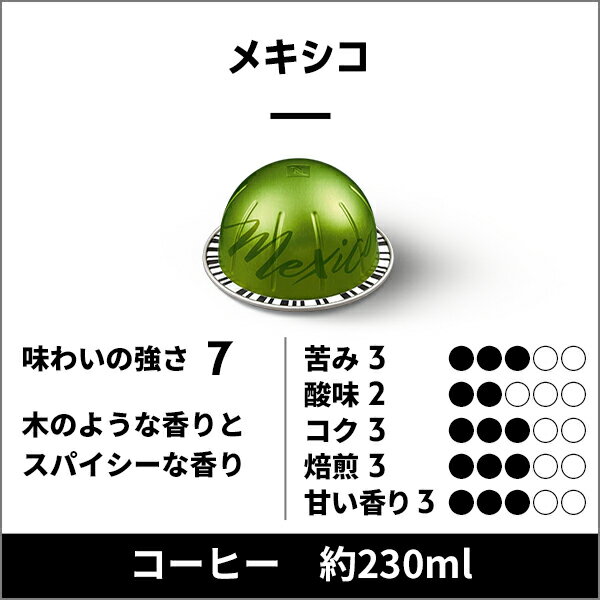 ヴァーチュオ マスター オリジンズ コーヒーセット 4種(40カプセル) 商品説明 【カップサイズ】グランルンゴ 約150 ml, マグ 約230 ml メキシコ 10カプセル(約230ml|木のような香りとスパイシーな香り|ダブルウォッシュト処理を施したロブスタ種コーヒーと、アラビカ種コーヒーのブレンド|味わいの強さ 7) コロンビア 10カプセル(約230ml|フルーティーでワインのような香り|水洗処理を施したアラビカ種コーヒー|味わいの強さ 5) エチオピア 10カプセル(約150ml|花のような香りと繊細な味わい|ドライプロセスで精製されたアラビカ種コーヒー|味わいの強さ 4) コスタリカ 10カプセル(約150ml|麦芽のような香りと豊かな甘み|温泉水で水洗処理を施したアラビカ種コーヒー|味わいの強さ 7) 名称 レギュラーコーヒー(アルミカプセル入り) 原材料名 コーヒー豆 内容量 95g (10カプセル) ×1本 -エチオピア 105g(10カプセル)× 1本 -コスタリカ 125g(10カプセル)× 2本 -メキシコ -コロンビア 賞味期限 それぞれの商品に印字記載。賞味期間の残存日数が3ヶ月以上のものを出荷しています。 保存方法 高温を避けて保存してください。 使用上の注意 ネスプレッソシステムコーヒーメーカー専用です。抽出後のカプセルは熱くなっていますので、取扱いにご注意ください。 原産国名 スイス 輸入者 ネスレネスプレッソ株式会社東京都品川区東五反田2-10-2マスター オリジンズ コーヒーセット 4種(40カプセル) ヴァーチュオ (VERTUO) 専用カプセル ■精製方法にこだわった、単一生産国のコーヒー豆のみを使用した4種のセット■ 単一生産国のコーヒーのみを使用し、その土地ならではの精製方法が施された個性豊かな味わいを楽しめる4種類のセットです。 カプセルコーヒー セット内容: ●メキシコ 10カプセル(約230ml|木のような香りとスパイシーな香り|ダブルウォッシュト処理を施したロブスタ種コーヒーと、アラビカ種コーヒーのブレンド|味わいの強さ 7) ●コロンビア 10カプセル(約230ml|フルーティーでワインのような香り|水洗処理を施したアラビカ種コーヒー|味わいの強さ 5) ●エチオピア 10カプセル(約150ml|花のような香りと繊細な味わい|ドライプロセスで精製されたアラビカ種コーヒー|味わいの強さ 4) ●コスタリカ 10カプセル(約150ml|麦芽のような香りと豊かな甘み|温泉水で水洗処理を施したアラビカ種コーヒー|味わいの強さ 7) ※お届けする商品のカプセル及びパッケージは、画像と異なる場合がございます。 ※セットの内容は予告なしに変更されることがございます。予めご了承ください。