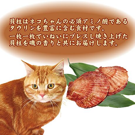 ■商品説明 ネコちゃんの必須アミノ酸であるタウリンを豊富に含む貝柱を100%使用。一枚一枚ていねいにプレスし焼き上げた貝柱を磯の香りと共にお届けします。保存料・着色料不使用。 ◆成分値 たん白質:70.0%以上、脂質:3.0%以上、粗繊維:0.1%以下、灰分:9.0%以下、水分:15.0%以下 ◆カロリー(100g当たり) 335Kcal ◆原材料名 いたや貝(貝柱) 国産 ◆年齢:6ヶ月~