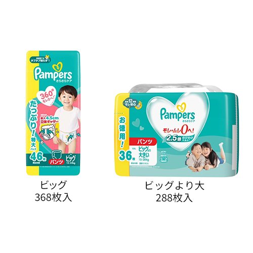 お店TOP>おむつ(パンツタイプ)>おむつ・パンツタイプ>パンパース さらさらパンツ>パンパース オムツ さらさらケア(パンツ) M L BIG BIG大 (4個×2セット)【パンパース オムツ さらさらケア(パンツ) M L BIG BIG大の商品詳細】★はいはい M/496枚入●パンパースさらさらケア 背中モレキャッチャー●モレ・ムレ0へ!●最長12時間モレ安心●背中モレキャッチャー:ゆるうんち・おしっこをせき止めるから、背中モレ安心。●+20%大きくなった*吸収体:おしっこも、ゆるうんちも、モレ安心。●3倍ワイド*ギャザー:脚の付け根までカバーして、横モレ0へ!●ふわっとドライ吸収シート●さらさら風通しライン●2.5倍**伸びるのびのびベルト●Sカーブフィット*2022年8月まで出荷のメーカー従来製品との比較**伸びる前との比較★たっち M/496枚入●パンパースさらさらケア 120% 超吸収ジェル※●モレ・ムレ0へ!●最長12時間モレ安心●3倍ワイド*ギャザー:脚の付け根までカバーして、横モレ0へ!●1秒吸収**シート:スポンジのように即吸収、お肌さらさら。●ふわふわ素材:やわらか素材の吸収体を使用。ずっとお肌快適。●さらさら風通しライン●2.5倍***伸びるのびのびベルト●12時間の吸収力●Sカーブフィット※メーカー従来品比較*2022年8月まで出荷のメーカー従来製品との比較**平均尿量に基づく(P&G調べ)2回のおしっこを想定***伸びる前との比較★L/432枚入●パンパースさらさらケア 120% 超吸収ジェル※●モレ・ムレ0へ!●最長12時間モレ安心●3倍ワイド*ギャザー:脚の付け根までカバーして、横モレ0へ!●1秒吸収**シート:スポンジのように即吸収、お肌さらさら。●穴あき通気カバー:通気穴から湿気を外に逃がすから、お肌さらさら。●さらさら風通しライン●2.5倍***伸びるのびのびベルト●12時間の吸収力●Sカーブフィット※メーカー従来品比較*2022年8月まで出荷のメーカー従来製品との比較**平均尿量に基づく(P&G調べ)2回のおしっこを想定***伸びる前との比較★ビッグ/368枚入●パンパースさらさらケア 120% 超吸収ジェル※●モレ・ムレ0へ!●最長12時間モレ安心●3倍ワイド*ギャザー:脚の付け根までカバーして、横モレ0へ!●1秒吸収**シート:スポンジのように即吸収、お肌さらさら。●穴あき通気カバー:通気穴から湿気を外に逃がすから、お肌さらさら。●さらさら風通しライン●2.5倍***伸びるのびのびベルト●12時間の吸収力●Sカーブフィット※メーカー従来品比較*2022年8月まで出荷のメーカー従来製品との比較**平均尿量に基づく(P&G調べ)2回のおしっこを想定***伸びる前との比較★ビッグより大/288枚入●パンパース オムツ さらさらケア 120% 超吸収ジェル※●モレ・ムレ0へ!●最長12時間モレ安心●3倍ワイド*ギャザー:脚の付け根までカバーして、横モレ0へ!●1秒吸収**シート:スポンジのように即吸収、お肌さらさら。●穴あき通気カバー:通気穴から湿気を外に逃がすから、お肌さらさら。●さらさら風通しライン●2.5倍***伸びるのびのびベルト●12時間の吸収力●Sカーブフィット※メーカー従来品比較*2022年8月まで出荷のメーカー従来製品との比較**平均尿量に基づく(P&G調べ) 2回のおしっこを想定***伸びる前との比較2023年12月11日 549824、549825、549826、549827、549828、549829 削除、574562、574563、574564、574565、574566 追加【規格概要】★枚数(適応体重)はいはい M/496枚入:62枚×8個 (5~10kg)たっち M/496枚入:62枚×8個 (6~12kg)L/432枚入:54枚x8個 (9~14kg)ビッグ/368枚入:46枚×8個 (12~22kg)ビッグより大/288枚入:36枚×8個 (15~28kg)★素材表面材:ポリオレフィン不織布/吸収材:ポリエステル不織布、ポリオレフィン不織布、 綿状パルプ、高分子吸水材/防水材:ポリオレフィンフィルム/止着材:粘着テープ/伸縮材:合成ゴム/結合材:ホットメルト粘着材【注意事項】★保管上の注意 開封後は、ほこりや虫が入り込まないよう、衛生的に保管してください。★使用上の注意(1)汚れた紙おむつは早くとりかえてください。(2)テープは直接お肌につけないでください。(3)誤って口に入れたり、のどにつまらせることのないよう保管場所に注意し、使用後はすぐに処理してください。お肌に合わないときは使用を中止し、医師に相談してください。・持ち手を誤って首にひっかけたり、のどに詰まらせたりすることのないように、乳幼児の手の届かないところに保管してください。(一社)日本衛生材料工業連合会のガイドラインに基づく表示【ブランド】パンパース【発売元、製造元、輸入元又は販売元】P&G(プロクター&ギャンブル)商品に関するお電話でのお問合せは、下記までお願いいたします。受付時間9:15-17:00(月-金曜日、祝日・年末年始を除く)衣料用洗剤・柔軟仕上げ剤:0120-021321食器用洗剤・布製品消臭剤・置き型消臭剤:0120-118226乳幼児用紙おむつ:0120-021329ヘアケア製品:0120-021327マックスファクター化粧品:0120-021325男性用・女性用グルーミング製品:0120-113937ブラウン製品(シェーバー、オーラルケア製品、脱毛器)のお問い合わせにつきましては、下記までお願いいたします。受付時間9:00-17:30(月-金曜日