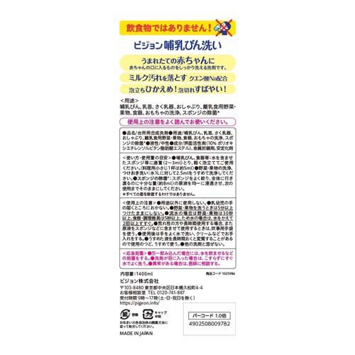 お店TOP>ベビー用食事用品>洗浄・消毒用品>ピジョン 哺乳びん洗い 詰めかえ用 2個分 (1.4L)【ピジョン 哺乳びん洗い 詰めかえ用 2個分の商品詳細】●うまれたての赤ちゃんに!赤ちゃんの口に入るものをしっかり洗える洗剤です。●野菜も洗える!離乳期にも大活躍。長く使える。●ミルク汚れを落とす!クエン酸Na配合【使用方法】★用途・哺乳びん、乳首、さく乳器、おしゃぶり、離乳食用野菜・果物、食器、おもちゃの洗浄、スポンジの除菌★使い方・使用量の目安・哺乳びん、食器等:水を含ませたスポンジ等に適量(2〜3ml)とり、軽く泡立ててご使用ください。(料理用小さじ1杯は約5ml)・野菜・果物の洗浄、つけおき洗い:水1Lに対して2.5mlをうすめて洗浄してください。・スポンジの除菌:スポンジをよく絞り、全体に行き渡るのに十分な量(約8ml)の原液を均一に浸透させ、次の使用までそのままにしてください。※すべての菌を除菌するわけではありません。【成分】界面活性剤(10%ポリオキシエチレンソルビタン脂肪酸エステル)、金属封鎖剤、安定化剤【注意事項】★使用上の注意・用途以外に使用しない。・乳幼児の手の届くところにおかない。・野菜・果物を洗うときは5分以上つけたままにしない。・流水の場合は野菜・果物は30秒以上、食器・調理器具は5秒以上、ため水の場合は、水を変えて2回以上すすぐ。・荒れ性の方や長時間使用する場合、また原液をスポンジなどに含ませて使用するときは、炊事用手袋を使う。・使用後は手をよく水で洗い、クリームなどでお手入れをする。・うすめた液を長時間おくと変質することがあるので使用のつど、うすめて使う。・他の洗剤と混ぜない。★応急処置・万一飲み込んだ場合には、水を飲ませるなどの処置をする。・洗剤が目に入った場合は、こすらずにすぐ水でよく洗う。・異常がある場合は、医師に相談する。【発売元、製造元、輸入元又は販売元】ピジョンリニューアルに伴い、パッケージ・内容等予告なく変更する場合がございます。予めご了承ください。ピジョン103-8480 東京都中央区日本橋久松町4番4号0120-741-887広告文責:楽天グループ株式会社電話:050-5306-1825[洗浄・消毒用品]