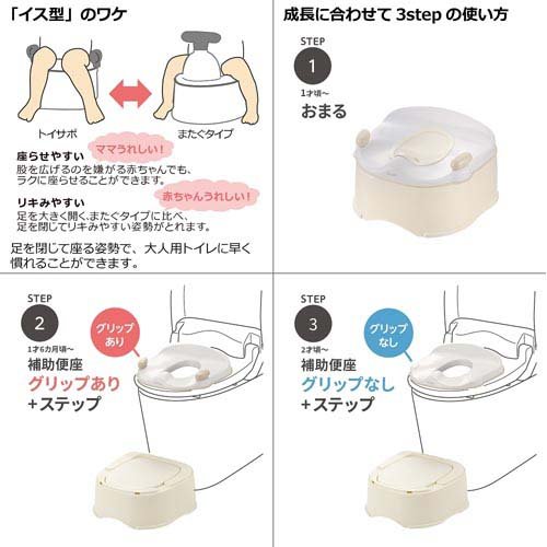お店TOP>おむつ・トイレ用品>おまる>リッチェル トイサポ おまる 1歳頃〜 ベージュ (1個)【リッチェル トイサポ おまる 1歳頃〜 ベージュの商品詳細】●前かがみになることで、リキみやすく、おしっこの飛び散りを軽減します。●足を閉じて座る姿勢で、大人用トイレに早く慣れることができます。●成長に合わせて3stepの使い方Step1:おまる(1歳頃〜)Step2:補助便座グリップあり+ステップ(1歳6カ月頃〜)Step3:補助便座グリップなし+ステップ(2歳頃〜)●座面に傾斜があるため、太ももが下がり、自然と前かがみになります。★補助便座●グリップをしっかり握ることで、姿勢が安定し、リキみやすくなります。●おしっこガードでおしっこの飛び散りを防ぎます。●前かがみになっても補助便座がガタつかず、安心してリキめます。●グリップは取り外しができます。●やわらか便座ガード付きで、横滑り、大人用便座へのキズを防ぎます。●固定具がついているので便座裏にしっかり固定でき、転倒やぐらつきを防ぎます。【規格概要】対象年齢:おまる:1才頃〜補助便座(グリップ付):1才6カ月頃〜4才頃補助便座(グリップなし):2才頃〜4才頃ステップ:1才6カ月頃〜6才頃体重目安:おまる:20kgまで補助便座:20kgまでステップ:30kgまでサイズ:34.5×33×20.5H(cm)材質:ポリプロピレン、熱可塑性エラストマー、他抗菌加工【発売元、製造元、輸入元又は販売元】リッチェル(Richell)リニューアルに伴い、パッケージ・内容等予告なく変更する場合がございます。予めご了承ください。リッチェル(Richell)939-0592 富山県富山市水橋桜木136076-478-2155広告文責:楽天グループ株式会社電話:050-5306-1825[おまる]