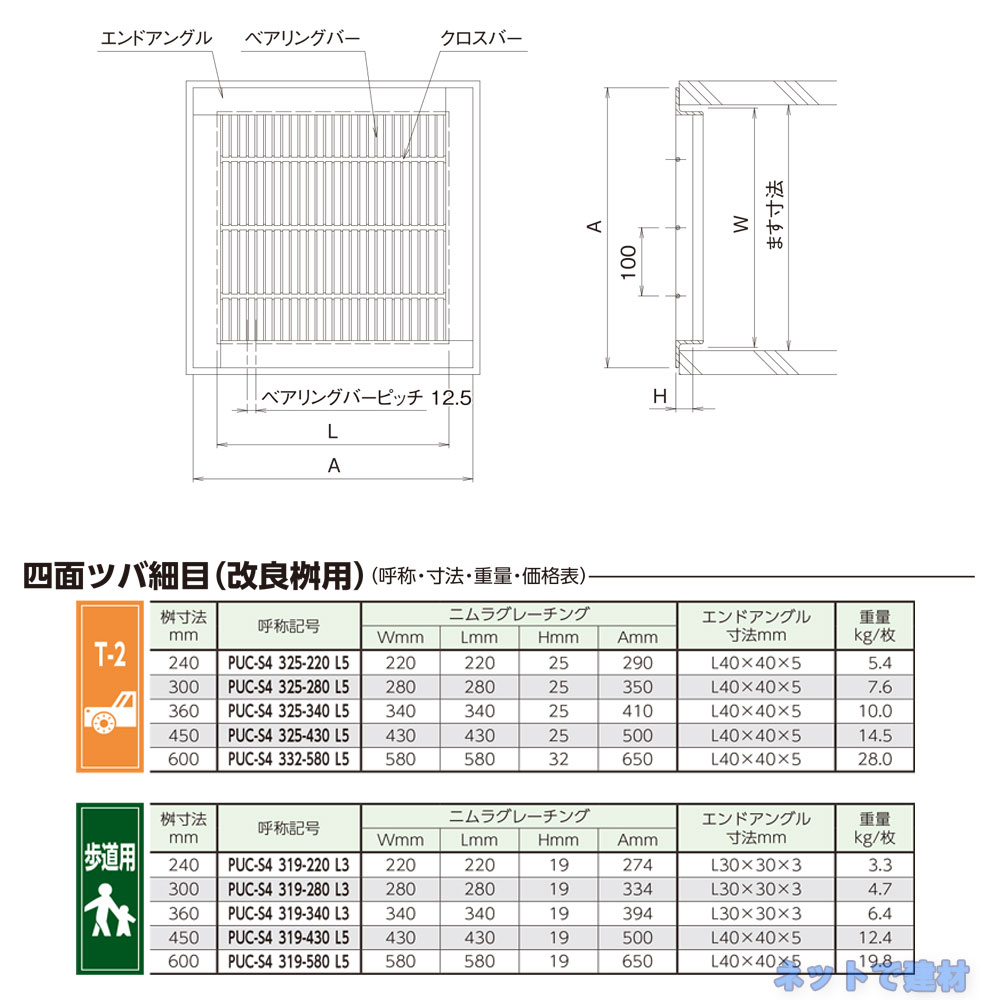 ●商品説明 ・商品名 四面ツバ 細目 改良桝用 (一般型) ・呼称記号 PUC-S4 325-340 L5 ・適用荷重 T-2 ・桝寸法 360 mm ・寸法 W 340 mm × L 340 mm × H 25 mm × A 410 mm ・エンドアングル寸法 L 40 mm × 40 mm × 5mm ・重量 約 10.0 kg ・材質 SS400 ・表面処理 溶融亜鉛めっき ・入数 1枚 ・メーカー ニムラ ●用途・使用例 グレーチング 四面ツバ 細目 改良桝用 改良桝用鋼板製 ます蓋 ますぶた 角マス ※ご注文数量によって受注生産になり、お届けに2週間前後お時間を要する場合がございます。