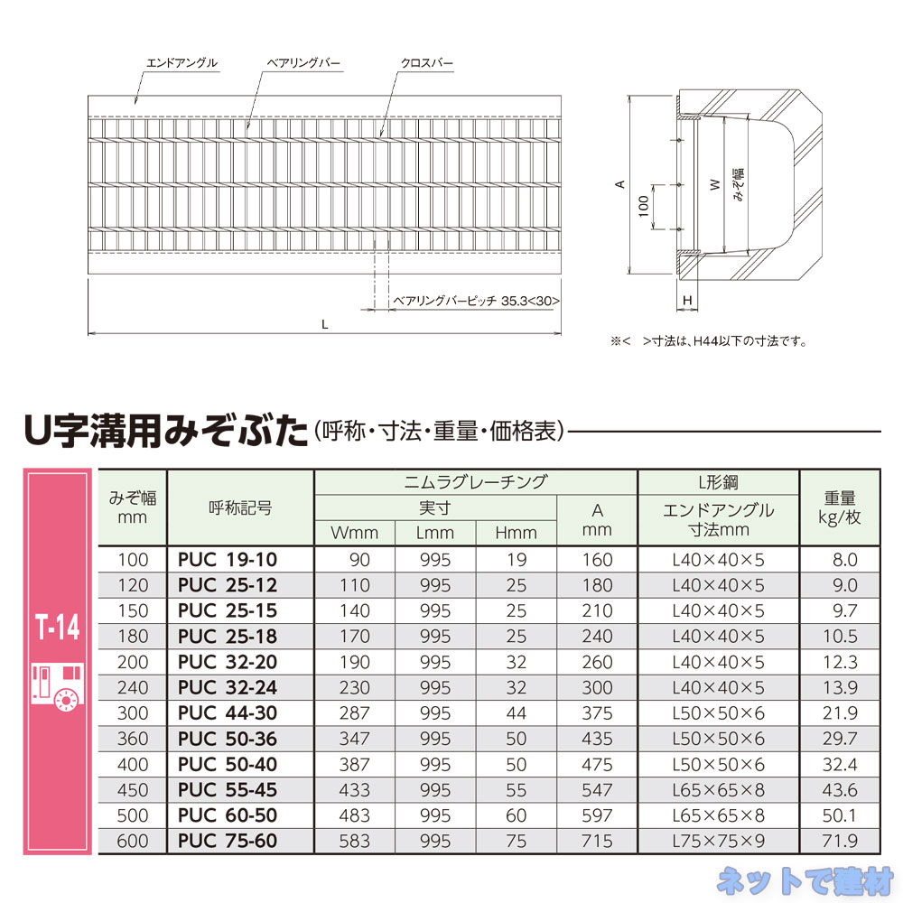 ●商品説明 ・商品名 U字溝用普通目みぞぶた (一般型) ・呼称記号 PUC 44-30 ・適用荷重 T-14 ・みぞ幅 300 mm ・寸法 W 287 mm × L 995 mm × H 44 mm × A 375 mm ・L型鋼:エンドアングル寸法 L 50 mm × 50 mm × 6 mm ・重量 約 21.9 kg ・材質 SS400 ・表面処理 溶融亜鉛めっき ・入数 1枚 ・メーカー ニムラ ●用途・使用例 グレーチング U字 U字溝タイプ U字溝用 普通目 鋼板製 みぞぶた 長方形 側溝 ※ご注文数量によって受注生産になり、お届けに2週間前後お時間を要する場合がございます。
