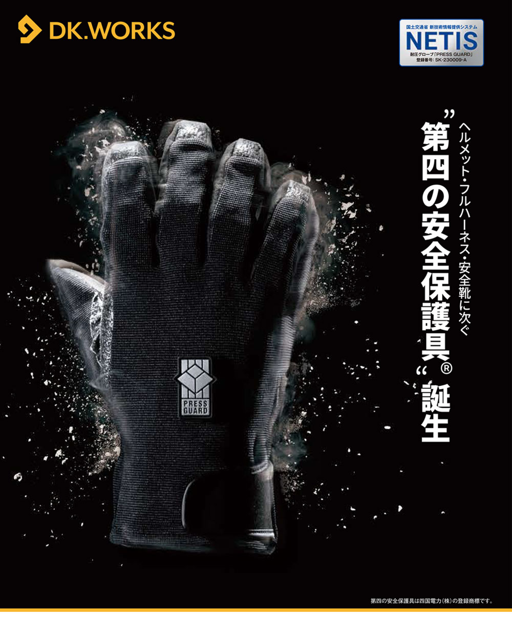 ●商品説明(共通) ・商品名:耐圧グローブ「PRESS GUARD/プレスガード」 ・サイズ:M/L/LL ・カラー:ブラック(黒) ・アウター素材: 甲部/ナイロン94% ポリウレタン6% 掌部/シリコーンレザー(シリコン50% ポリエステル50%) ・インナー素材:ポリエステル100% ・生産国:中国 ・メーカー:DK.WORKS ○商品説明(型番別) ・アウター/インナーセット ・型番:PG-300 ・重量:約135g(Lサイズ/片手) ○商品説明(型番別) ・アウターのみ(交換用) ・型番:PG-301 四国電力株式会社と共同開発・耐圧板が上下に加わる圧力から指をしっかりガード ほとんどの作業において指を使うこともあり、手は最も負傷しやすい部位です。 そのため、手の保護を目的とした作業用手袋は多く流通していますが、指部に圧力が加わった時にけがを防止できるものは多くありません。 特に建設作業現場においては指の挟まれ事故も少なくない状況に着目し、耐圧手袋を開発しました。 手袋片手につき14個の異なる形状の耐圧板を配置することで、指の動きを妨げない構造を実現させているのが最大の特徴です。 ●特徴 ・優れたグリップ力 ・耐摩耗性 ・14枚(片手)の金属板を配置した特殊構造 ・刃物や尖ったものに対する優れた防刃性 ・最もこだわった機能、指先の操作性 ・カラビナループで紛失防止 ・アウターとインナーは分離可能 ・洗濯可能 ・メンズ時計と同じくらいの重量 ●注意 ・指の挟まれに対する防護性能が最大の特徴ではありますが、完全に防護することを保証するものではございません。 使用条件や現場作業内容によって防護性能が異なりますので、事前に作業内容を確認の上使用するようにしてください。 ●用途 作業用手袋 安全手袋 DIY プレート入り