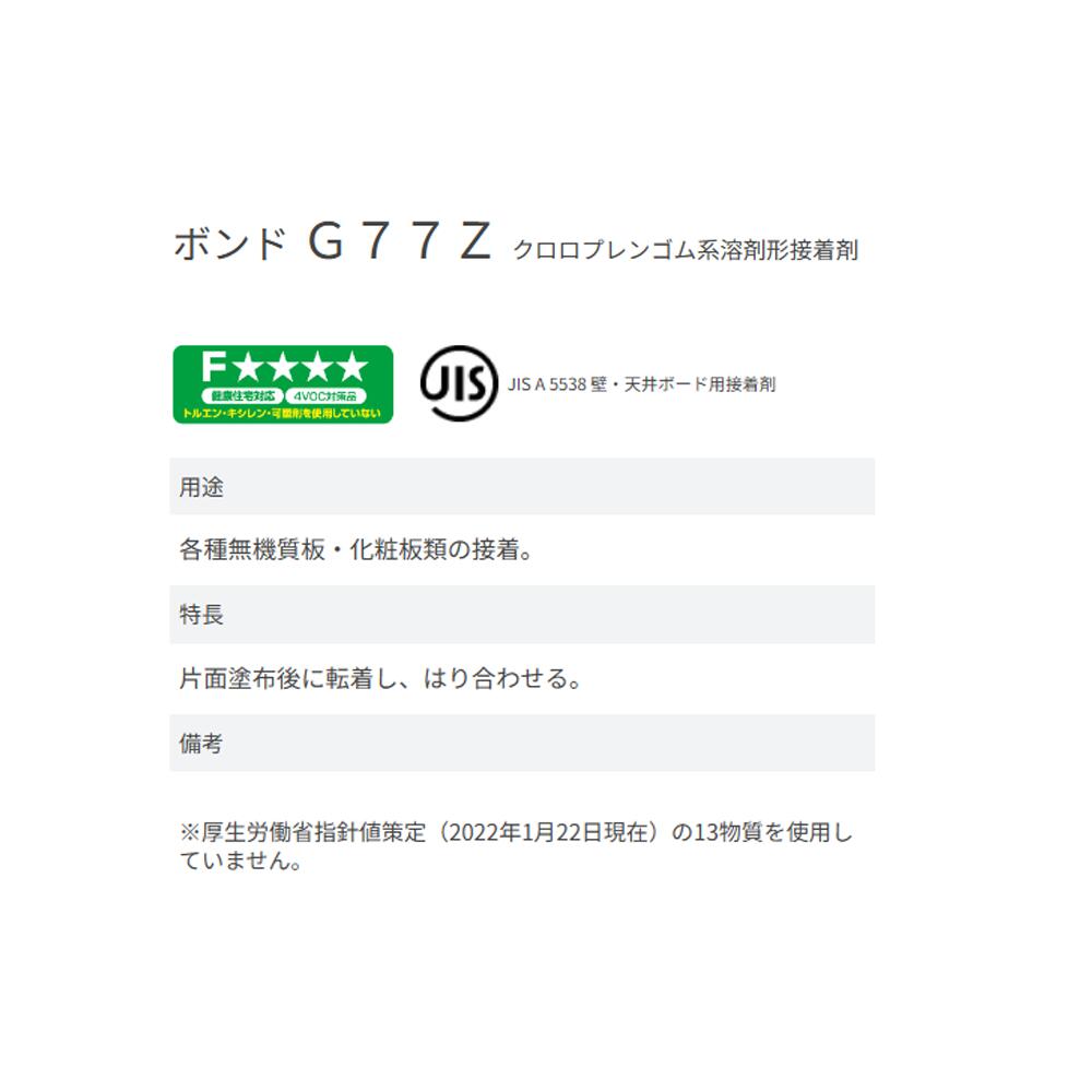 メーカー直送品です。納期をご相談させていただく場合があります。 商品名 G77Z 容量 330ml サイズ (個装)W51×D311 (外箱)30本:W315×D260×H335(12.5kg) 品番 #05282 入数 30本 用途 各種無機質板・化粧板類の接着 クロロプレンゴム系溶剤形接着剤 用途 各種無機質板・化粧板類の接着。 特長 片面塗布後に転着し、はり合わせる。 備考 ※厚生労働省指針値策定(2022年1月22日現在)の13物質を使用していません。 その他ボンド商品はコチラ↓