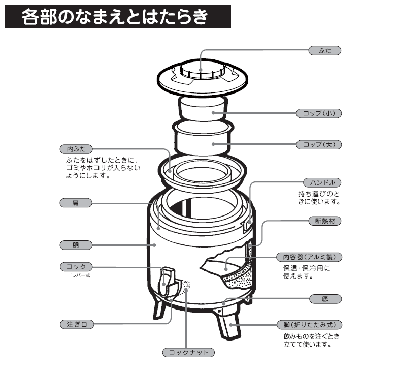 商 品 説 明 材質 内容器:アルミニウム製胴の種類:鋼(プリント鋼版) 本体サイズ (約)幅245×奥行276×高さ275mm 本体質量 (約)1.4kg 容量 6.1L 保温効力 70度以上(6時間) コップの数 2個 コックの種類 レバー式 内ふた・脚 有り カラー シルバー カラー シルバー 特徴 ●スポーツにレジャーに幅広く活躍する広口キーパー。●アルミ製内容器使用。●脚は折りたたみできます。●保温・保冷。●2WAYコック。レバーを手前に引くだけで注水OK、倒す角度により少量注水と連続注水が可能。●広口タイプ。約14.8cmと口径が広いので、大きめ氷も簡単に入ります、また内容器も洗いやすくお手入れもラクラクです。 備考 コックを止めた後に、コック内の残留水が数秒出る仕様に変更となっております。 ご使用について必ずお守り下さい 強い酸、アルカリなどの飲料水、水質改善剤(備長炭等)、特にアルカリイオン水やスポーツドリンクなどはいれないでください。また飲み物を長期保管しないでください。ご使用後はできるだけ早く内容器の内部をよく洗い、ふたをしないで内部をよく乾燥させてください。 製造 日本 メーカー ピーコック魔法瓶 関連ワード:ウォータージャグ ジャグ キーパー 保冷 キャンプ スポーツ アウトドア レジャー 部活 運動会 体育祭 水筒 冷水筒 大容量 麦茶 レバー INC-60 INC-80 INC-100