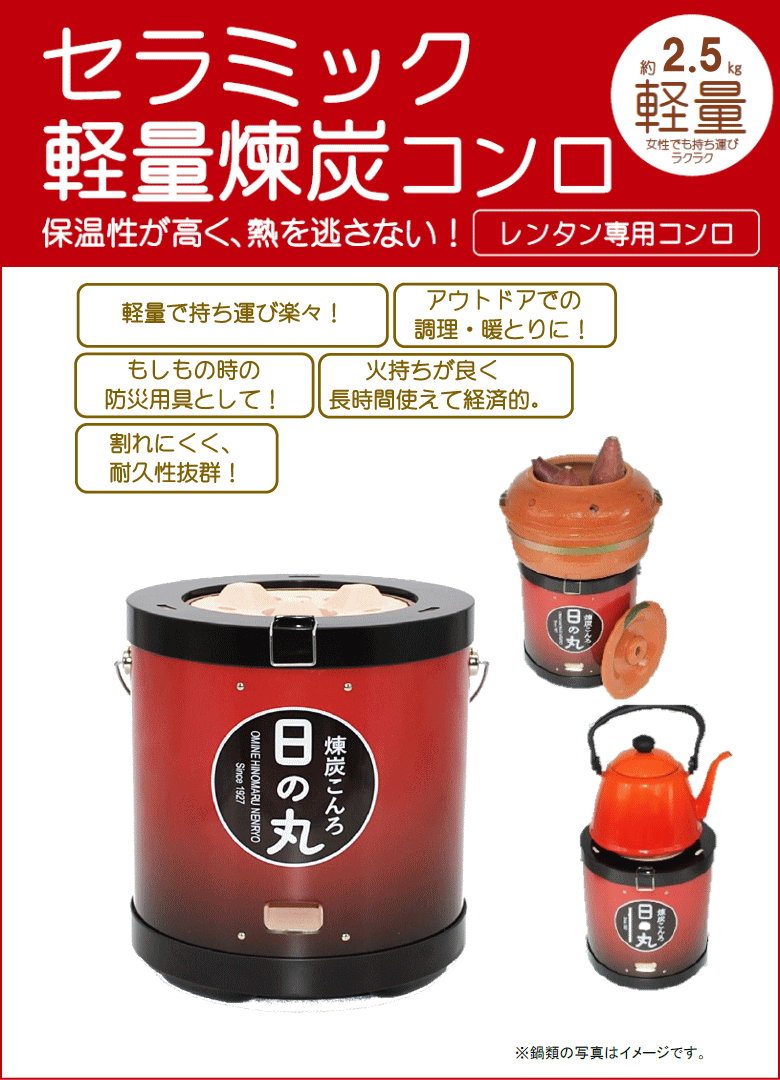 商 品 説 明 材質 外側:ブリキ 内側:セラミックファイバー サイズ (約)直径220×高さ250mm 重量 約2.5kg 特徴 ●軽量で耐久性に優れたレンタンコンロです。 ●外側がブリキ、内側がセラミックファイバー仕様で耐久性が高く、軽量で燃焼効率も向上しています。 ●鉄製の目皿付き(表面クロムメッキ加工)。 ●軽量で持ち運ぶ楽々。 ●火持ちが良く長時間使えて経済的。 ●割れにくく、耐久性抜群。 用途 ●アウトドアでの調理・暖とりに。 ●もしもの時の防災用具として。 注意 こちらの商品は、火力の強い設定で製造されておりますので、レンタンこたつの使用には不向きとなります。 製造 中国 メーカー 大嶺日の丸燃料 関連ワード: 練炭コンロ レンタンコンロ れんたんコンロ コンロ セラミック 軽い 卓上 アウトドア バーベキュー BBQ キャンプ 調理 防災 災害