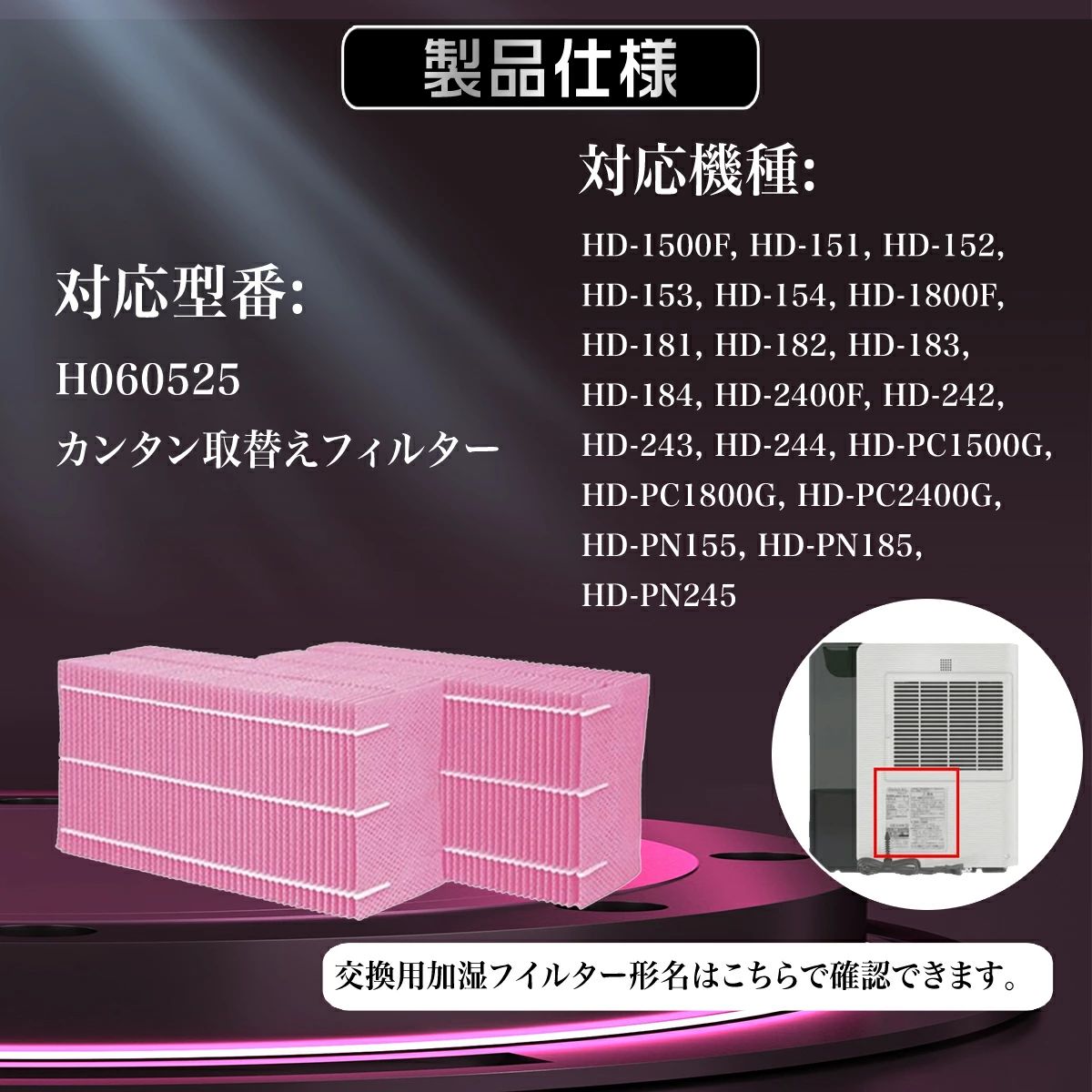 商品情報 商品番号 ダイニチ交換用空気加湿器 カンタン取替えフィルター、(使い捨てタイプ)互換品。 型番:H060525、H060519 タイプ抗菌気化フィルター の使い捨てタイプです ※純正品ではございません。(同等にご使用いただけますのでご安心ください。) 製品仕様 サイズ:220x135x90mm、 材質:レーヨン・プラスチック(ポリエステル) 製品機能 加湿フィルター抗菌、防カビ方法: フィルターに抗菌・防カビ剤を含浸、トレイ内の雑菌・カビの繁殖を抑えます。 均等な穴開けパターンによる瞬時吸水,独自開発の峰谷折り畳み構造:山部で水分を保持しつつ谷部で通気性を確保,立体構造が蒸発面積を約2.8倍に拡大(従来品比)。エアコンの乾燥が気になる冬場でも、当商品の立体メッシュが効率的な加湿を実現。就寝中の喉の乾燥を防ぎ、快適な湿度環境を維持します。 交換目安 1日8時間運転、水道水の硬度50mg/L(全国平均値)の場合で、約3ヶ月です。お手入れは不要で、汚れたら新しいものに交換するだけです。 配送説明 ★配送料について 全国一律送料無料(ヤマト運輸) (沖縄・離島一部地域は追加送料がかかる場合があります。) 対応機種 【適用機種】HD-1500F, HD-151, HD-152, HD-153, HD-154, HD-1800F, HD-181, HD-182, HD-183, HD-184, HD-2400F, HD-242, HD-243, HD-244, HD-PC1500G, HD-PC1800G, HD-PC2400G, HD-PN155, HD-PN185, HD-PN245 ※適応機種を必ず確認の上、ご注文をお願い致します。 注意事項 ★対応機種をお確かめの上、ご注文ください。 ★純正品ではなく、互換品でございます。(同等にご使用いただけますのでご安心ください。) 純正品をお求めのお客様がお控えください。 商品到着後、非純正品による返品・キャンセルがお引き受けしかねます。予めご了承ください。 ★長期不在・住所不明による再発送の場合、600円の配送料がお客様のほうでご負担でございます。ご了承ください。