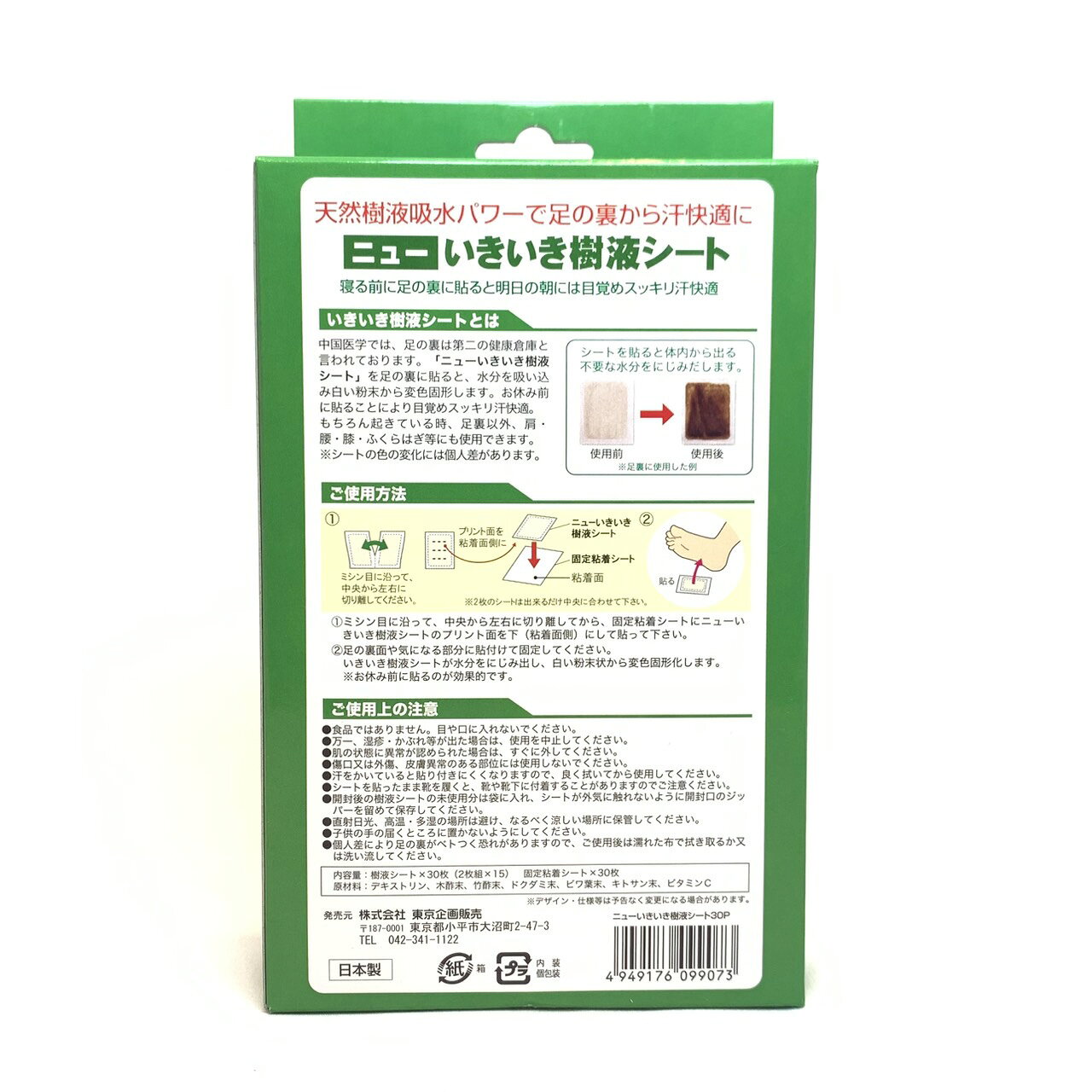 ●商品名 NEWいきいき樹液シート 30枚入 [樹液シート] 健康グッズ フットケア 美容 トプラン TO-PLAN foot care -寝る前に足の裏に貼ることで、翌朝の目覚めをすっきりとさせ、足の疲れやむくみの軽減が期待できます。 ●製品の特徴 使用方法:寝る前に足の裏に貼るだけで、翌朝の目覚めがすっきりします。 変化:シートは水分を吸収し、白い粉末状から変色・固形化します。 使用部位:足の裏だけでなく、肩、腰、膝、ふくらはぎなどにも使用可能です 。 ●主な成分 -デキストリン、木酢末、竹酢末、どくだみ末、ビワ葉末、キトサン末、ビタミンC -これらの天然成分が、体内の余分な水分を吸収し、足の疲れやむくみの軽減をサポートします 。 -天然樹液吸水パワーで足の裏から汗快適に! -寝る前に足の裏に貼ると、明日の朝には、目覚めスッキリ汗快適! ●いきいき樹液シートとは -中国医学では、足の裏は第二の健康倉庫と言われております。「いきいき樹液シート」を足の裏に貼ると、水分を吸い込み白い粉末から変色固形します。 -お休み前に貼ることにより目覚めスッキリ汗快適。もちろん起きている時、足裏以外、肩、・腰・膝・ふくらはぎ等にも使用できます。 ●ご使用方法 -固定粘着シートにニューいきいき樹液シートのプリント面を下(粘着面側)にして貼って下さい。 -足の裏面や気になる部分に貼付けて固定してください。いきいき樹液シートが水分をにじみ出し、白い粉末状から変色固形化します。 【ご使用上の注意】 -食品ではありません。目や口に入れないでください。 -万一、湿疹・かぶれ等が出た場合は、使用を中止してください。 -肌の状態に異常が認められた場合は、すぐに外してください。 -傷口又は外傷、皮膚異常のある部位には使用しないでください。 -汗をかいていると貼り付きにくくなりますので、良く拭いてから使用してください。 -シートを貼ったまま靴を履くと、靴や靴下に付着することがありますのでご注意ください。 -開封後の樹液シートの未使用分は袋に入れ、シートが外気に触れないように開封口のジッパーを留めて保存してください。 -直射日光、高温・多湿の場所は避け、なるべく涼しい場所に保管してください。 -子供の手の届くところに置かないようにしてください。 -個人差により足の裏がベトつく恐れがありますので、ご使用後は濡れた布で拭き取るか又は洗い流してください。 販売会社:株式会社東京企画販売 JANコード4949176099073