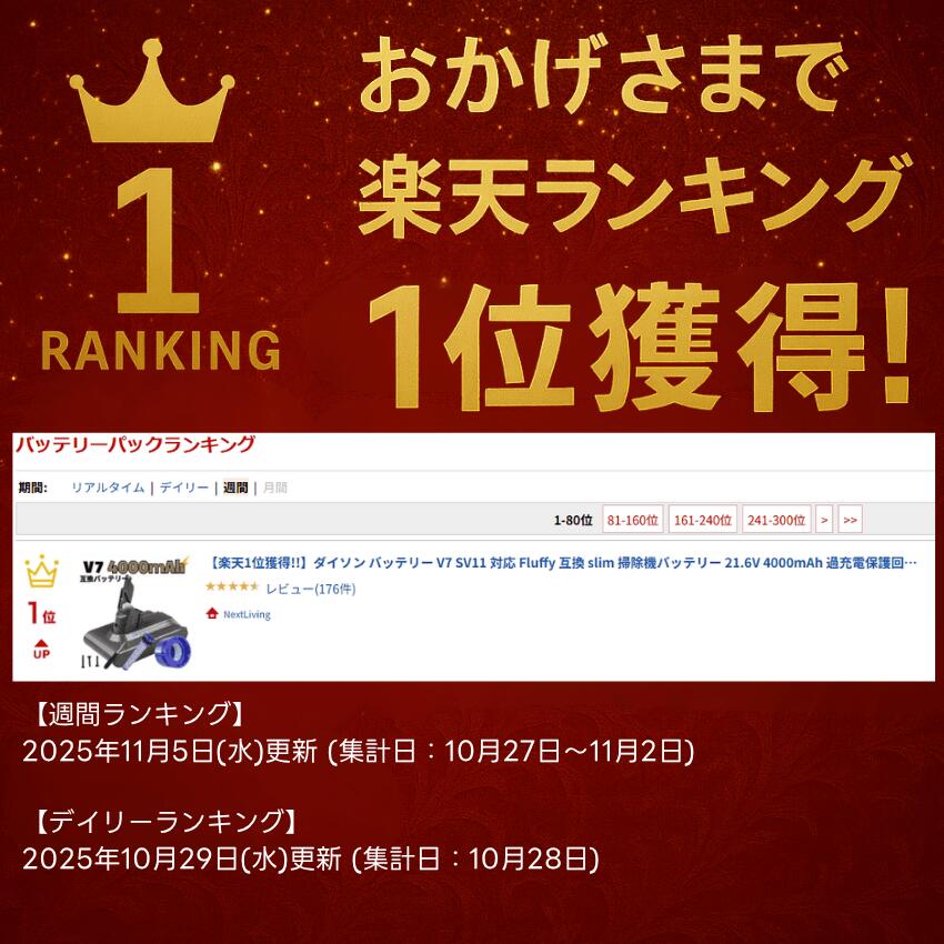 【楽天1位獲得!】ダイソン バッテリー V7 SV11 対応 Fluffy 互換 slim 掃除機バッテリー 21.6V 4000mAh 過充電保護回路搭載 純正同等性能 充電池 コードレスクリーナー バッテリー交換 取説付き (V7/1個)