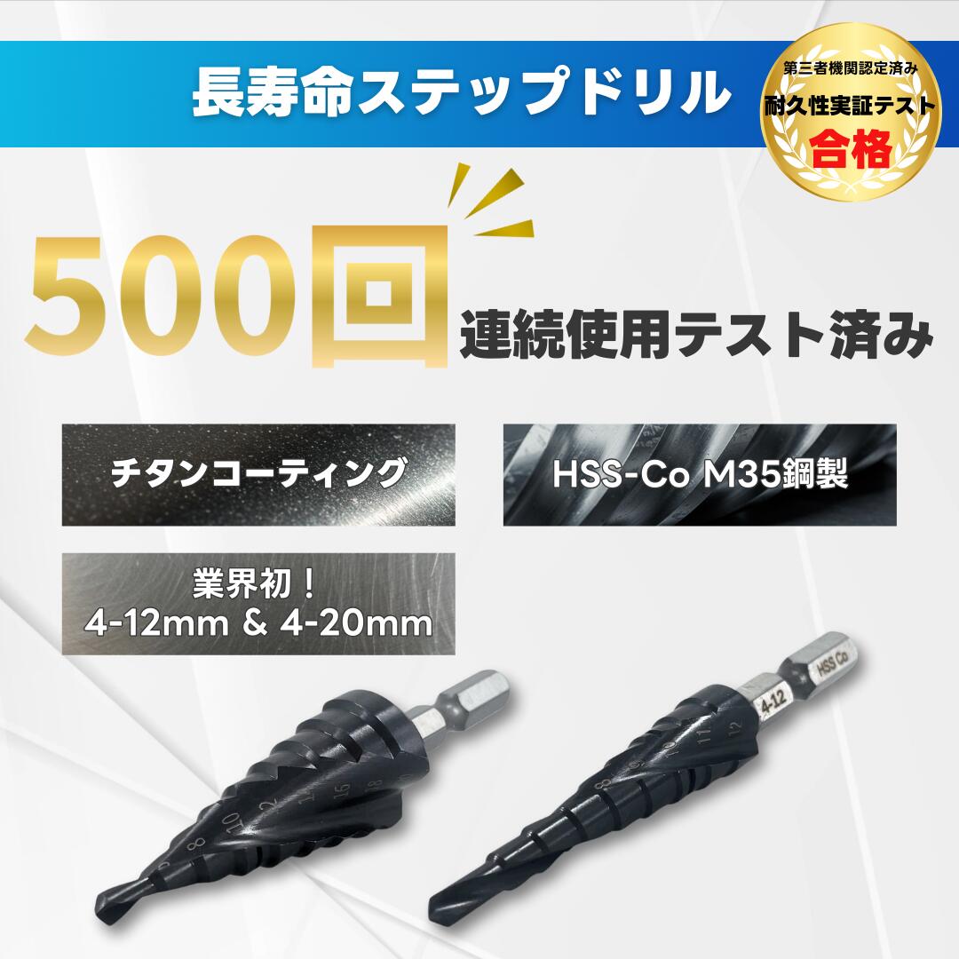 スパイラル ステップドリル マキタ 互換 電動ドリル HRC89 チタンコーティング 六角軸 たけのこ 穴あけ ドリルビット 2本セット 4-12mm/4-20mm 9段 ステンレス 鉄工用 Longsafe (SDB201/2種)