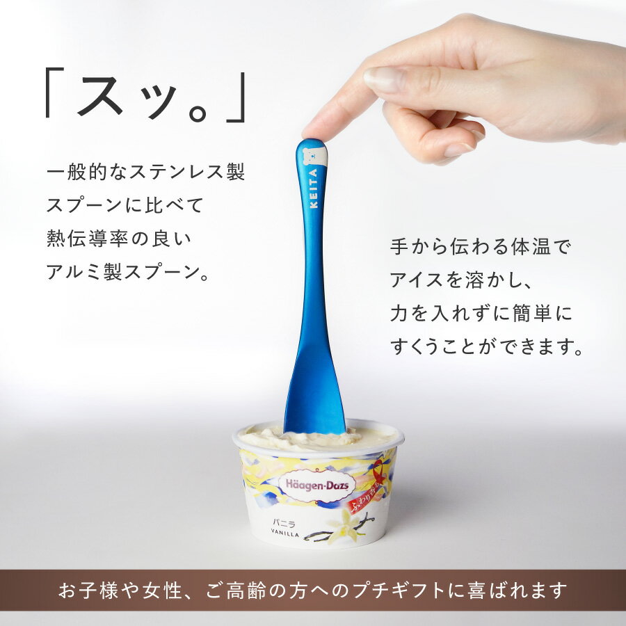 商品について 製品説明: 一般的なステンレス製スプーンに比べ熱伝導率がよく、 固いアイスクリームも伝わる体温で溶かすことができます。 先端部はカップの底まですくいやすい形状になっているので最後の一口までアイスクリームをお楽しみいただけます。 ちょっとした贈り物として贈り物として喜ばれます。 カ ラ ー :ブラック、シルバーレッド、ゴールドピンク、ブルー 商品サイズ :最大幅約27mm×全長約150mm 材 質 :アルミニウム 重 量 :約15g おすすめのシーン 還暦祝い/父の日/母の日/敬老の日/誕生日/入学祝い/卒業祝い/卒園/卒団/卒業記念品/就職祝い/昇進祝い/周年記念/創立記念/バレンタイン/ホワイトデー/クリスマス/持ち運び/贈り物/ギフト/プレゼント/おしゃれ ご注意: ※風合いに違いが生じる場合があります。 ・ご使用用途以外でに使用しないでください。 ・電子レンジ・オーブンには入れないでください。 ・直接火にかけないで下さい。 ・食洗機でのご使用は出来ません。アルカリ性洗剤により表面のアルマイト加工が溶けます。 ・初めて使用するとき、お手入れのときは食器用洗剤等をスポンジにつけてよく洗浄して下さい。 ・ヒビやカケが入った場合は、安全のためご使用をお止め下さい。 ・本商品は、原則として、ご注文後のキャンセル、変更等は受付することができません。名入れ内容等ご確認の上ご注文をお願いいたします。 配送について ・こちらの商品はメール便送料が本体代金に含まれております。 ※宅配便をご希望のお客様は配達日時を注文日より4日後以降にご指定頂くことが可能です。 ※沖縄・離島、一部地域は、通常の配送時間に加え4−5日ほどお時間をいただく場合がございます。 ※沖縄・離島、一部地域は、通常の配送料金に追加料金税込み 1500円となります。 ※配送の状況によりましてはご指定通りにお届けできない場合がございます。 ※商品画像はイメージとなります。 ※パッケージ等は予告なしに変更となる場合ございます。