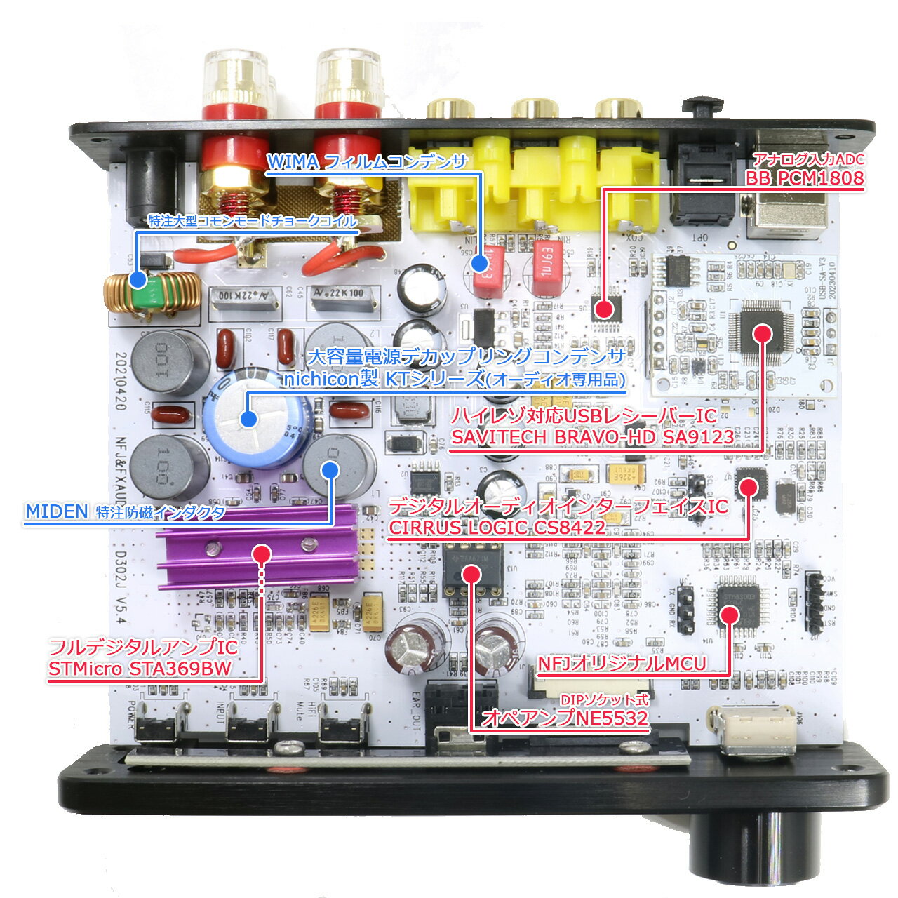 2024年2/22販売より、新ロットへリニューアル 今回、メイン基板回路の変更はございません。 ・電源デカップリングコンデンサをニチコン製KTシリーズオーディオ用コンデンサに変更 新開発の電極箔、新開発の電解液、高音質に対応したPETスリーブ等の最適な組み合わせにより、従来の105℃保証品では得られなかった高音質を実現。 耐久性、高音質の両方を実現したハイグレードなオーディオ用電解コンデンサです。 オーディオ用コンデンサの採用により、高音質化を狙いました。 入力端子からデジタルアンプICまで全てをデジタル信号で伝送することで、経路上での音質劣化を最小限に抑えた高音質フルデジタルアンプです。 ロングセラーとして好評を頂いております、ハイレゾ対応フルデジタルアンプ製品「D302J+」をベースに、USBレシーバーチップとして新しい世代のSAVITECH社製BRAVO-HD「SA9123L」を採用し、USB接続で最大24bit/192kHzに対応した上位モデルです。 「高級オーディオに負けない音質」をコンセプトに、高音質・多機能・操作性を追求し、USB入力の対応サンプリングレートが強化されました。 【製品の特徴】 ■高級アンプに負けない音質 高級機の音質に匹敵する聴き味になるよう、使用パーツを吟味し回路設計の改善を重ねています。 従来のフルデジタルアンプとは別格の高音質をお楽しみいただけます。 ■フルデジタルアンプ STMicroelectronics製「STA369BW」を搭載 入力からアンプICまでをフルデジタル化することで音の劣化を最小限にし、 デジタルアンプのメリットを最大限に引き出しています。 ■SA9123L採用によりUSB入力がハイレゾ24bit/192kHzに対応 新しい世代のUSBレシーバーIC SAVITECH社製BRAVO-HD「SA9123L」の採用により、USB入力においても最大24bit/192kHzのサンプリングレートに対応しました。 ■デジタル入力3系統(ハイレゾ対応)+アナログRCA入力1系統を装備 光デジタル/同軸デジタル/USB の3系統デジタル信号入力に加え、アナログ入力にも対応。 フロントの入力セレクトボタンで簡単に、USB・光・同軸・RCAの合計4系統入力の切り替えを可能としました。 PC・TV・CDプレーヤー・DAC等、複数種類の機器と接続し、切り替えてお使い頂けます。 【注意事項】 ※本製品は電源別売です。ご使用いただくにあたり、別途ACアダプターが必要となります。 ※ヘッドフォン出力端子は4極プラグ(TRRS)は動作保証対象外です。 ※本製品はDSD、及びサラウンド入力(ドルビーデジタル等)は、サポートしておりません。 ※PCとのUSB接続時、環境によってはOSのオーディオ出力設定が必要な場合がございます。 ※スマホやタブレット等のモバイルOS搭載端末との接続は、端末の仕様又はソフトウェアの相性により認識できない場合がございますので動作保証対象外としております。 ※製品保証期間はお買上げ日より6ヶ月間です。 【製品仕様】 ブランド:FX-AUDIO- 製品型番:D302J++ カラー:ブラック 製品保証期間:お買上げ日より6ヶ月間 アナログ入力:【1系統】ステレオRCA端子 デジタル入力:【3系統】USB TypeB端子/光デジタル音声入力(角型)/同軸デジタル音声入力 ヘッドフォン出力:3.5mmステレオミニジャック※4極プラグ(TRRS)は動作保証対象外です。 対応フォーマット: PCM 2chステレオ 最大24bit 192kHz 出力端子:2chステレオスピーカー出力 (バナナプラグ対応金メッキ端子) 最大出力:最大15W×2ch(電源入力12V・4Ω時) / 対応スピーカー:4Ω〜16Ω フルデジタルパワーアンプIC:STMicroelectronics製 STA369BW USBレシーバー IC:SAVITECH社製 BRAVO-HD SA9123L オーディオレシーバー IC:Cirrus Logic製 CS8422 ADC IC:Texas Instruments製 Burr-Brown PCM1808 ヘッドフォン回路オペアンプ:Texas Instruments製 NE5532 機能:デジタル3系統+アナログ1系統入力切替・トーンコントロール機能・ミュート機能 電 源:DC12V / 電源容量2A以上 (ACアダプター別売) 電源コネクター:外径5.5mm 内径2.1mm (センタープラス仕様) 付属品:説明書 サイズ:幅133mm×奥行き108mm×高さ33mm(突起部を除く) 重量:410g 【動作対応OS(USB接続)】Windows 11/ 10/ MacOS X / 9.1以降 USB AUDIO CLASS 2.0対応:Windows10 Creators Update バージョン1703 ビルド15063 以降 Mac OS X 10.6.4以降 ※Windows10以降及びMacOSについてはOS標準ドライバで動作します。 ※モバイルOS搭載機器は動作保証対象外です※ モバイルOS搭載機との接続は、端末の仕様又はソフトウェアの仕様等により認識できない場合がございますので動作保証対象外としております。 ※動作保証はしておりませんが、一部のモバイル機での動作を確認しておりますので、参考情報として掲載いたします。 ・iPhone6/iPhoneSE/iPhoneXR/iPhoneX (Lightning - USB 3カメラアダプタでの接続) ※改良等の理由により、予告なく仕様およびデザインを変更する事があります。