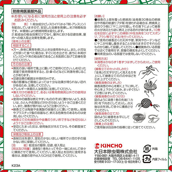 ※大変申し訳ございませんが、沖縄県へのお届けにつきましては、 ご注文金額に関わらず、全商品、送料無料の対象外とさせて頂きます。 ※沖縄県以外(一部地域を除く)へのお届けは、梱包箱100サイズ ×1個までであれば、6,500円(税別)以上のご注文で、佐川急便の陸送にて送料無料でお届けいたします。 100サイズを超える商品や、空輸でのお届けをご希望の場合は、ご注文金額にかかわらず送料を頂戴いたします。 ※お取り寄せとなる場合もあり、 発送までに3〜10日程お日にちを頂戴することがございます。 ※お一人様3個まで。 ■製品特徴 ◇金鳥の蚊取り線香。 ◇対象害虫:蚊。 ◇殺虫効果が約7時間持続。 ◇一世紀以上の長い伝統に裏付けられた確かな品質。 ◇除虫菊など厳選した天然原料を用い、製造から品質管理まで日本の自社工場で徹底して行っている、日本製品質です。 ◇10巻入り。 ■ご使用方法 〇渦巻型1巻をとってその一端に点火して徐々に燻焼させて使用してください。 ※渦巻はかならず1巻ずつはずしてから点火し、ご使用ください。 <線香立てのセットのしかた> 「金鳥」の文字が正しく見える方を上にして線香立ての爪の中ほどを引き上げてください。 <線香渦巻のはずし方> 線香渦巻の中心を軽く上下に押して、中心を上下からつまみ、まっすぐ引いて2巻にはずしてください。 <線香渦巻の火のつけ方> 渦巻1巻の先端(1カ所)を下向きにして点火し、点火後は炎を消して徐々に燻焼させてください。 <線香渦巻の立て方> 線香を水平にしてさしこんでください。 ■使用上の注意 【相談すること】 ・万一、身体に異常を感じたときは使用を中止し、また、小児などが誤って食べた場合は、すぐに吐き出させ、直ちに本剤がピレスロイド系の殺虫剤であることを医師に告げて診療を受けてください。 【その他の注意】 ・換気の良い場所の風上に置いてご使用ください。 しめ切った部屋で長時間使用すると、目・鼻・のどなどに刺激を感じることがあります。 ・アレルギー体質の人は使用に注意してください。 ・付属の線香皿や専用器具以外での使用はしないでください。 ・燃え易いもののそばで使用しないでください。 ・線香皿のカバーを開けるときはカバー側面を持ち、内側に指を入れないでください。 ・線香皿の白いマットは取り出さないでください。 ・小児の手が届かない所でご使用ください。 ・安定した平らな所でご使用ください。 ・線香の燃焼中に缶の取っ手を持って移動したり、吊下げた状態で使用しないでください。 ・線香の燃焼中、線香皿に線香以外のものを入れないでください。 ・付属の線香皿や蚊遣りブタ等を使う場合は、線香を覆う部分のウラ側に付着したヤニが線香に落下し火が消えたり逆に燃え上がる恐れがあります。 10巻を目安にヤニの掃除(中性洗剤をつけスポンジ、ブラシ等でこする)をしてください。 ・使用後は灰が冷めてからその都度、灰を捨ててください。 ■保管および取扱い上の注意 ・直射日光を避け、湿気の少ない涼しい場所で小児の手の届かない所に保管してください。 【お願い】 ・ご使用中の線香近くの天井や壁、家具やカーテンなどにヤニが付着し着色することがありますのでそれらのものから離して設置してください。 ・観賞魚のいる部屋では近くで使用せず、部屋の換気をよくしてください。 ・飼育昆虫のいる部屋では使用しないでください。 ■お問い合わせ先 大日本除虫菊株式会社 〒550-0001 大阪市西区土佐堀1-4-11 TEL:06-6441-1105 受付時間:9:00〜17:00(土・日・祝日を除く) ■広告文責 ナイスドラッグ(06-4257-3385) <登録販売者> 中島 一人 ■区分 防除用医薬部外品・日本製