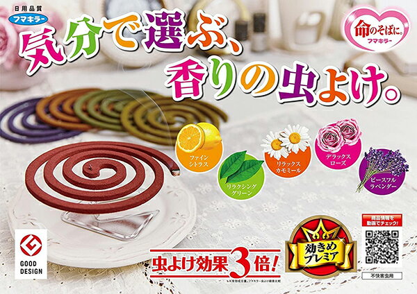 ※大変申し訳ございませんが、沖縄県へのお届けにつきましては、 ご注文金額に関わらず、全商品、送料無料の対象外とさせて頂きます。 ※沖縄県以外(一部地域を除く)へのお届けは、梱包箱100サイズ ×1個までであれば、6,500円(税別)以上のご注文で、佐川急便の陸送にて送料無料でお届けいたします。 100サイズを超える商品や、空輸でのお届けをご希望の場合は、ご注文金額にかかわらず送料を頂戴いたします。 ※お取り寄せとなる場合もあり、 発送までに3〜10日程お日にちを頂戴することがございます。 ※お一人様2個まで。 ■製品特徴 ◇選べる5つの香り! お香感覚で気軽に使えてリラックスタイムにもぴったり。 目にもうれしいカラフルな色合いも魅力です。 ☆ファインシトラス 10巻 ☆リラクシンググリーン 10巻 ☆リラックスカモミール 10巻 ☆デラックスローズ 10巻 ☆ピースフルラベンダー 10巻 ◇パワフルな効きめ! 有効成分を増量し、3倍の虫よけ効果を実現しました。 ※当社虫よけ線香比較 ◇約7時間効きめが続く! ◇50巻函入り。 ■対象害虫 ユスリカ、チョウバエ ■ご使用方法 〇はずし方 線香の中心を指で軽く押して、両側から指先でつまみ軽く動かしながら離してください。 ※線香の先端部分は固定されていますので折らないように切り離してください。 〇火のつけ方 線香一巻きの先端部分を下向きにし、一カ所だけ点火してください。 点火後は炎を消し、徐々に燻焼させてください。 〇線香の立て方 缶のフタを裏返すと、そのまま線香皿になります。 線香立ての真ん中を垂直に起こし、先端に線香を水平に差し込んでお使いください。 万一、折れた場合は、線香の端を差し込んでお使いください。 ■使用上の注意 ・火災防止のため、線香立ては必ず線香よりも大きいサイズの、陶器か金属の皿などの上に置いてください。 ・線香皿にたまった灰は、ご使用後灰が冷えてから、その都度お捨てください。 ・本品は必ず付属の線香立て、または別売の「フマキラー蚊とり線香皿吊り下げ式」をお使いください。 ■原材料 dl・d-T80-アレスリン、ソルビン酸カリウム、安息香酸ナトリウム、着色剤、タルク、香料、植物混合粉、他1成分 ■保管および取扱い上の注意 ・直射日光や湿気を避け、小児の手の届かない涼しいところに保管すること。 ■お問い合わせ先 フマキラー株式会社 〒101-8606 東京都千代田区神田美倉町11 フリーコール:0077-788-555 受付時間 : 9:00〜17:00(土・日・祝日および弊社指定休業日を除く) ■広告文責 ナイスドラッグ(06-4257-3385) <登録販売者> 中島 一人 ■生産国 日本