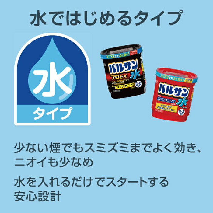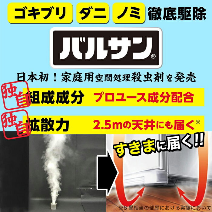 ※大変申し訳ございませんが、沖縄県へのお届けにつきましては、 ご注文金額に関わらず、全商品、送料無料の対象外とさせて頂きます。 ※沖縄県以外(一部地域を除く)へのお届けは、梱包箱100サイズ ×1個までであれば、6,500円(税別)以上のご注文で、佐川急便の陸送にて送料無料でお届けいたします。 100サイズを超える商品や、空輸でのお届けをご希望の場合は、ご注文金額にかかわらず送料を頂戴いたします。 ※お取り寄せとなる場合もあり、 発送までに3〜10日程お日にちを頂戴することがございます。 ●使用期限:使用期限まで180日以上あるものをお送りします。 お薬によっては期限が短いものもございます。 180日未満の期限の医薬品に関しましては、別途ご連絡の上ご送付いたします。 ■製品特徴 ◇煙もニオイも少ない、お部屋を汚さない ◇強い噴出力でスミズミまでよく効く ◇水を入れるだけの簡単始動 ◇火災警報器を煙から守る専用カバー付き ◇初めてでも使い方がわかりやすいユニバーサルデザイン ◇12〜16畳用 25g ※人体に使用しないこと ■効能・効果 ゴキブリ、屋内塵性ダニ類、イエダニ、ノミ、トコジラミ(ナンキンムシ)、ハエ成虫、蚊成虫の駆除 ■用法・用量 (天井までの高さ2.5mを目安として) ○適用害虫:ゴキブリ、屋内塵性ダニ類、イエダニ、ノミ、トコジラミ(ナンキンムシ) 12.5g:6〜8畳(10〜13平方メートル)に1個 25g:12〜16畳(20〜26平方メートル)に1個 ○適用害虫:ハエ成虫、蚊成虫 12.5g:12〜24畳(20〜40平方メートル)に1個 25g:24〜48畳(40〜80平方メートル)に1個 ■成分・分量 有効成分 メトキサジアゾン・・・6% ペルメトリン・・・8% (添加物) アゾジカルボンアミド、酸化亜鉛、ヒプロメロース、ソルビタン脂肪酸エステル、香料、その他1成分 ■使用方法 必ずご使用前にお読みください ○使用前に準備すること 1.部屋(窓や換気口など)を閉め切り、害虫の隠れ場所となる戸棚、引き出し、押入れなどを開放する。なお、食品、食器、おもちゃ、寝具、衣類、仏壇仏具などは直接煙が触れないように、ビニールシートや新聞紙でカバーをするか、部屋の外に出す。 2.煙が触れないようにテレビ、パソコン、オーディオ製品などの精密機器やピアノなどの楽器にはカバーをする。ディスクやテープ類は付属のケースに入れる。 3.ペット類や観賞魚、植物などは部屋の外に出す。 4.煙を感知する火災警報器、微粒子を感知するガス警報器は反応することがあるので、袋などで覆う。 火災警報器、ガス警報器の取扱いについては、付属の説明書をよく読みご使用ください。 ○「水ではじめるバルサン」を始める 1.フタを外し、天面のシールをはがす。金属缶の入ったアルミ袋、添付文書、警報器カバーを取り出す。 ※アルミ袋は使用直前に開封してください。 2.水をプラスチック容器の黒破線のところまで正しく入れる。 ※水を入れ過ぎたり、水が少ないと効果に影響を与えることがあります。 水を入れたプラスチック容器を部屋の床面のほぼ中央に置く。アルミ袋を開け、金属缶を取り出し、↑が上になるように水に浸してフタをはめる。 3.約30秒後に約20〜30秒間勢いよく煙が出る。(その後徐々に弱まり、約8分間続く) 煙が出始めたら部屋の外に出て、2〜3時間またはそれ以上、そのまま部屋を閉め切る。 ※まれに熱によってフタ、プラスチック容器が変形することがありますが、安全性、有効性等の品質に影響はありません。 ○使用後に行うこと 1.所定時間部屋を閉め切った後、煙を吸い込まないようにして窓や扉を開放し、充分に換気してから中に入る。 2.部屋の床は駆除した害虫を除去するため、掃除機をかける。 3.食器などが煙に触れた場合は、水洗いしてから使う。 4.使用後の容器は、各自治体の廃棄方法に従って捨てる。 ※屋内塵性ダニ類は死骸もアレルギーの原因になると言われています。バルサンをした後、畳・カーペットのダニは掃除機をかけ取り除きましょう。寝具類のダニ退治には、天日干し後、入念に掃除機をかけるか、クリーニングをおすすめします。 ○お部屋を閉め切る時間 ゴキブリ、屋内塵性ダニ類、イエダニ、ノミ、トコジラミ(ナンキンムシ)の駆除:2〜3時間 またはそれ以上 ハエ成虫、蚊成虫の駆除:30〜60分間 またはそれ以上 ■使用上の注意 【してはいけないこと】 (1)病人、妊婦、小児は薬剤(煙)に触れないようにしてください。 (2)煙を吸い込まないよう注意してください。 (3)煙が出始めたら部屋の外に出て、所定時間(2~3時間)以上経過しないうちに入室しないでください。 (4)使用後は充分に換気をしてから中に入ってください。 【相談すること】 (1)煙を吸って万一身体に異常を感じたときは、できるだけこの説明文書を持って直ちに本品がオキサジアゾール系殺虫剤とピレスロイド系殺虫剤の混合剤であることを医師に告げて、診療を受けてください。 (2)今までに薬や化粧品等によるアレルギー症状(発疹・発赤、かゆみ、かぶれなど)を起こしたことのある人は、使用前に