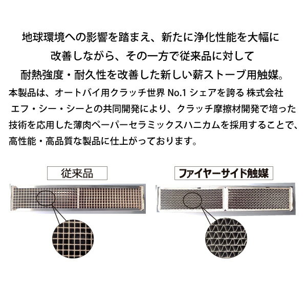 ファイヤーサイド 薪ストーブ用触媒 イントレピッドII スモールウィンターウォーム用[31153]▼地球環境への影響を踏まえ、新たに浄化性能を大幅に改善さらに耐熱強度・耐久性を改善した新しい薪ストーブ用触媒オートバイ用クラッチ正解No1シェアを誇る 株式会社 エフ・シー・シーとの共同開発により、クラッチ摩耗材開発で培った技術を応用した薄肉ペーパーセラミックスハニカムを採用することで、高性能・高品質な製品に仕上がっております。■特徴1〜PM排出量 50%低減〜オリジナルペーパーハニカム構造により、セルの壁面積up → 従来品に対してPM排出量を半減ペーパーハニカム採用による薄肉化を達成したことで、触媒反応に活用する壁面積を従来品比2倍に拡大することができたことから、PM浄化性能の大幅向上を実現しました。■特徴 その2.〜 耐熱強度向上 〜熱膨張を抑制したマット素材を採用 → 従来品に対して熱変形を大幅に軽減触媒ケースの変形、ハニカムBOXの破損は、ケースとハニカムBOXの間にあるマットが熱膨張により膨張する事で発生します。 従来のマットは熱により片側最大 2.5 mm、両側で最大 5 mmの熱膨張が見られ、ケースやハニカムBOXの変形・破損の原因となっていました。ファイヤーサイド触媒はマットの熱膨張を抑えた素材を採用し高温時でもケース、ハニカム BOX にかかる荷重を大幅に低減できたことから、従来品に対して耐熱強度に優れています。■特徴その3〜触媒耐久性能向上〜ペーパーハニカムによる表面性状の優位性→ 従来品に対して触媒層の剥離耐久性向上従来の触媒では過度な熱が加わった時、ハニカム内に付着させた触媒層の剥離が発生していました。これは、押出製法のハニカムBOXの表面にはアンカー効果が殆どない事が要因の一つとなっています。新しいファイヤーサイド触媒は、ペーパーハニカムを採用しており、繊維質の特徴である表面凹凸を活かしたアンカー効果によって、長期間の使用においても触媒層の剥離が抑制されています。※ご注意 〜ファイヤーサイド触媒の取り扱いについて 〜ファイヤーサイド触媒品の特徴としまして、浄化性能及び耐久性が向上した反面、ハニカム部のセル密度が高く、灰(フライアッシュ)が積もりやすくなっています。灰(フライアッシュ)は通常燃焼では消えてなくなりますが、従来同様定期清掃を行うようにお客様へ推奨をお願いします。清掃を行うにあたっては、取扱説明書に記載いたしますが、柔らかい刷毛でブラッシングしても、ハニカムBOX の破損は無い事を確認しております。■仕様サイズ:約W168×D65×H51mm重量:340g材質:外筒/ステンレス、マット/アルミ、ハニカム/ペーパーセラミック生産国:日本※製品ロットにより色が異なる場合がありますが、品質上、問題はありません。※優れた燃焼効率を維持するためには、定期的な保守点検が必要です。消耗の度合いにより、新品と交換してください。・アスベスト不使用[適応品]イントレピッドII、 スモールウィンターウォームバーモント用触媒:旧品番:30001153と同じ商品です。関連商品一覧薪ストーブ用触媒・デファイアント#1940、アンコール#2550、ウィンターウォーム用・イントレピッドII、スモールウィンターウォーム用・アンコール#2040、デファイアント#1975用[ ファイヤーサイド ファイアーサイド ファイヤサイド ファイアサイド FIRESIDE FIRE SIDE 触媒 薪ストーブ 暖炉 ストーブ メンテナンス お手入れ ストーブケア 掃除 清掃 大掃除 薪ストーブアクセサリー 薪アクセ 薪アクセサリー キャタリティックコンバスター キャタリティック コンバスター ペーパーセラミック セラミック ハニカム Catalytic Combustor イントレピッドII イントレピッド2 イントレピッド スモールウィンターウォーム ]2021/10/06