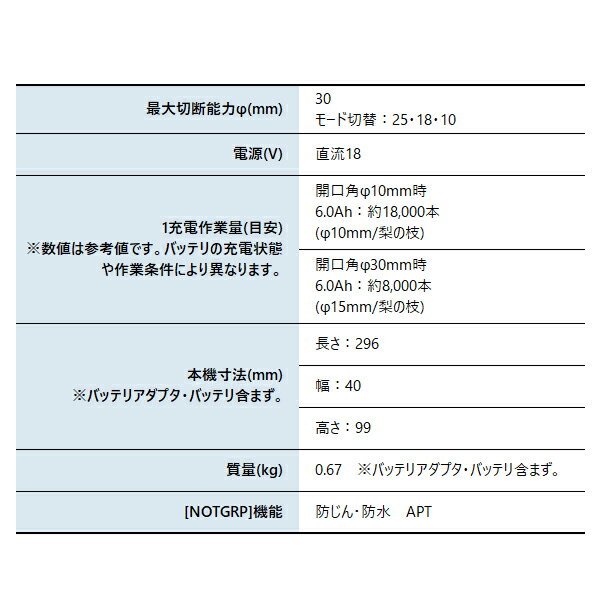マキタ(makita) 18V 充電式せん定ハサミ 本体のみ[UP180DZK]▼軽い、小さい、握りやすい、作業負荷を軽減、バッテリアダプタタイプ■特長●ハイパワーで切れ味シャープパワフルな18V仕様で最大切断径Φ30mmの太枝もシャープに切断。●「高性能」コアレスハイパワーブラシレスモータ搭載中空構造+スリムなモータ形状で、連続作業時にグリップ部に熱を持ちにくい。さらにスリムで握りやすい細経グリップを実現。●作業負荷を軽減「バッテリアダプタタイプ」18Vバッテリを腰回りに分離し、腕への負担を軽減する「バッテリアダプタタイプ」。軽量、コンパクト、握りやすいボディで快適なせん定作業を実現。●枝の太さに合わせて、開口角を4段階切替作業に最適な開口角設定で効率アップ。1充電あたりの作業量(BL1860B使用時/目安)開口角Φ10mm:約18,000本(梨の枝Φ10mm程度)開口角Φ18mm:約10,000本(梨の枝Φ15mm程度)開口角Φ25mm:約9,000本(梨の枝Φ15mm程度)開口角Φ30mm:約8,000本(梨の枝Φ15mm程度)●開口角度はボタンで調整上刃を閉じ、ボタン長押しで切替。●モータ搭載のセンサにより、刃がスムーズにトリガと連動低速時のトリガ追従性にも優れ、快適な使用感を実現。●切込み深さ調整機能付刃物を研いだ後や交換時等に切込み深さ調整が可能。上刃を閉じ、ボタン3秒以上長押しで調整。●作業間のホルスタへの仮収納に便利な「待機モード」トリガを約3秒以上引き続けると刃物が完全に閉じた位置で停止。オートパワーオフ■放置時間が約5分でランプ(緑)点滅■放置時間が約15分でランプ(緑)消灯トリガを2回・?ュと復帰します。●バッテリを腰回りに分離、コード長さ1.4mのバッテリアダプタ標準付属作業時にコードを地面に擦りにくい最適なコード長さ(1.4m)に設定。様々な高さのせん定作業を快適にこなせます。部品番号:A-76962●別販売品でコード長さ5.0mのバッテリアダプタもご用意梨などの幹を中心とした四方のせん定、長時間作業時に最適なコード長さ5.0mのロングタイプ。バッテリを腰に着けず、地面に置いての使用や、棚や高所作業車へ掛けたり、用途に合わせたせん定作業が可能です。部品番号:A-76831※別売品についてはショップ、またはメーカーにお問い合わせください。●防滴・防じん「アプト」※注意:本製品は水や粉じんによる影響が抑えられるように設計されていますが、水や粉じんによって故障しない事を保証するものではありません。●ホルスタ&マックパックタイプ3標準付属各種アイテムをまとめて収納・持ち運びに便利です。■その他特長●分解せずに刃物用オイルを外側から注油可能●対応する18Vバッテリは圧倒的な互換性草刈機、ハンディソー、ブロワ、運搬車、ファンジャケット、保冷温庫、インパクトドライバ、マルノコ、スマートフォン充電、クリーナ、ファン、ライトなど300モデル以上に共通使用可能。 ■仕様【最大切断能力】30mm(モード切替:25・18・10mm)【電源】直流18V【製品寸法】長さ296×幅40×高さ99mm※バッテリアダプタ・バッテリ含まず。【質量】0.67kg※バッテリアダプタ・バッテリ含まず。【1充電作業量(目安)】 開口角Φ10mm時6.0Ah:約18,000本(Φ10mm/梨の枝) 開口角Φ30mm時6.0Ah:約8,000本(Φ15mm/梨の枝)※数値は参考値です。バッテリの充電状態や作業条件により異なります。【NOTGRP機能】防じん・防水 APT【適応バッテリ】※バッテリを充電するには別売りの充電器が必要です。 ●18Vリチウムイオンバッテリ BL1860B、BL1850B、BL1850、BL1840、BL1830B、BL1830、BL1820B、BL1815N【kk9n0d18p】[ 伐木 伐採 林業 農林 マキタ makita まきた makita パワーツール 林業用品 充電式 バッテリー式 電動 木 枝 庭 ガーデン ガーデニング 畑 家庭菜園 果樹園 樹木 剪定 せん定 はさみ ハサミ 鋏 剪定ばさみ せん定ばさみ 剪定バサミ せん定バサミ 剪定はさみ せん定はさみ 剪定ハサミ せん定ハサミ 剪定鋏 せん定鋏 DIY 工具 道具 枝切りバサミ 枝切りハサミ 枝切りばさみ 枝切りはさみ 枝きりバサミ 枝きりハサミ 枝きりばさみ 枝きりはさみ 電動バサミ 電動ばさみ 電動ハサミ 電動はさみ 電動剪定鋏 UP180DZK UP180 DZK UP180-DZK ]2023/10/03 適格請求書発行事業者