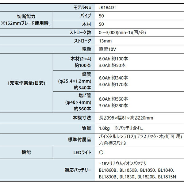 マキタ(makita) 18V 充電式レシプロソー 本体のみ[JR184DZ]▼抜群の取り回し+優れた作業能率作業にあわせて使える2つのスイッチ付■特長●抜群の取り回し+優れた作業能率作業にあわせて使える2つの無段変速スイッチ、マルチポジションスイッチ●パドルスイッチ力を入れる作業や保持したい時に●使いやすさ極まるコンパクト・レシプロソー●バッテリ残容量表示 ■仕様【モデルNo】JR184DT【切断能力】 パイプ:50mm 木材:50mm※152mmブレード使用時。【ストローク数】0〜3,000(min-1)(回/分)【ストローク】13mm【電源】直流18V【1充電作業量(目安) 】 木材(2×4) 6.0Ah:約100本 3.0Ah:約50本 鋼管(Φ25.4×1.2mm) 6.0Ah:約340本 3.0Ah:約170本 塩ビ管(Φ48×4mm) 6.0Ah:約560本 3.0Ah:約280本【本機寸法】長さ398×幅81×高さ220mm【質量】1.7kg※バッテリ含む。【付属品】 バイメタルレシプロ刃(プラスチック・木/釘可 用) 六角棒スパナ3【機能】 LEDライト:〇【適応バッテリー】●18VリチウムイオンバッテリBL1860B、BL1850B、BL1850、BL1840、BL1830B、BL1830、BL1820B、BL1815N※国内仕様のメーカー純正品です。並行輸入品・互換品・再生品ではございません。※安全に商品をご使用いただくために、マキタ製充電式製品には、マキタ純正のバッテリー・充電器をご使用いただきますようお願いします。なお、当店では模倣品、互換品のバッテリー・電池パック、リサイクル修理されたバッテリー・電池パックのご使用に起因する事故・故障につきましては、一切の責任を負いかねますのでなにとぞご了承ください。【kk9n0d18p】[ マキタ MAKITA 正規販売店 DIY 電動工具 ツール 工具 大工 日曜大工 電動 充電式 バッテリー式 コードレス ワイアレス ワイヤレス 鋸 のこぎり ノコギリ レシプロソー レシプロ ソー ]2025/05/07