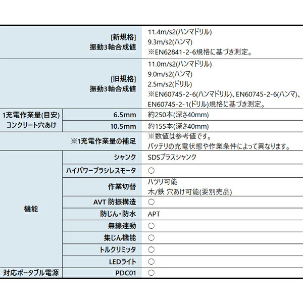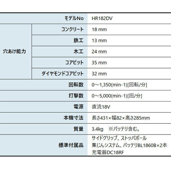 マキタ(makita) 18V 充電式ハンマドリル集じんシステム付 青18mm バッテリー ・充電器付き[HR182DRGXV]▼高速穴あけ&自己集じん(DV仕様のみ)低振動AVT付で快適穴あけ●上向き穴あけをクリーンに集じん率約95%以上。(上向き穴あけΦ10.5mm 深さ60mm、コンクリート圧縮強度40N/mm2)捕集率の高い高性能フィルタを採用し、粉じんをしっかり捕集。●作業スピード 約70%、作業量 約30%アップ※Φ10.5mm 深さ60mm (コンクリート圧縮強度40N/mm2)※メーカー16mmクラス比。数値は参考値です。●圧倒的な低振動振動3軸合成値「ハンマ」9.0m/s2「ドリル」2.5m/s2「ハンマドリル」11.0m/s2●フィルタクリーニングダイヤルを回すと、フィルタからチリが落ち、集じん性能を維持。●ワンタッチ脱着可能集じんシステムを外せば通常のハンマドリルにチェンジ。●無線連動集じん可能工具のスイッチを入れれば集じん機が起動。充電式でも連動集じんが行え、現場がよりクリーンに。※別販売品の無線連動集じん機、ワイヤレスユニット、集じんカップ、グリップベースセット品が必要です。 ■仕様【モデルNo】HR182DV【穴あけ能力】 コンクリート:18mm 鉄工:13mm 木工:24mm コアビット:35mm ダイヤモンドコアビット:32mm【回転数】0〜1,350min-1[回転/分]【打撃数】0〜5,000min-1[回転/分]【電源】直流18V【充電時間】バッテリBL1860B(1本)、充電器DC18RF 実用充電:約27分 フル充電:約40分【[新規格]振動3軸合成値】 ハンマドリル:11.4m/s2 ハンマ:9.3m/s2※EN62841-2-6規格に基づき測定。【[旧規格]振動3軸合成値】 ハンマドリル:11.0m/s2 ハンマ:9.0m/s2 ドリル:2.5m/s2※EN60745-2-6(ハンマドリル)、EN60745-2-6(ハンマ)、EN60745-2-1(ドリル)規格に基づき測定。【1充電作業量(目安)コンクリート穴あけ】 6.5mm:約250本(深さ40mm) 10.5mm:約155本(深さ40mm)※数値は参考値です。バッテリの充電状態や作業条件によって異なります。【本機寸法】長さ:431×幅:82×高さ:285mm【質量】3.4kg※バッテリ含む。【標準付属品】 サイドグリップ ストッパポール 集じんシステム バッテリBL1860B×2本 充電器DC18RF プラスチックケース※ビットは別売品です。【機能】 シャンク:SDSプラスシャンク ハイパワーブラシレスモータ:○ 作業切替:ハツリ可能 木/鉄 穴あけ可能(要別売品) AVT 防振構造:○ 防じん・防水:APT 無線連動:○ 集じん機能:○ トルクリミッタ:○ LEDライト:○【対応ポータブル電源】 PDC01:〇届出事業者名:株式会社マキタPSマークの種類:PSE※国内仕様のメーカー純正品です。並行輸入品・互換品・再生品ではございません。※安全に商品をご使用いただくために、マキタ製充電式製品には、マキタ純正のバッテリー・充電器をご使用いただきますようお願いします。なお、当店では模倣品、互換品のバッテリー・電池パック、リサイクル修理されたバッテリー・電池パックのご使用に起因する事故・故障につきましては、一切の責任を負いかねますのでなにとぞご了承ください。【kk9n0d18p】[ マキタ MAKITA 正規販売店 DIY 充電式 バッテリー式 電動 電動工具 工事 作業 ハンマドリル ハンマードリル ドリル 穴あけ 穴開け 集塵 ]2025/05/13