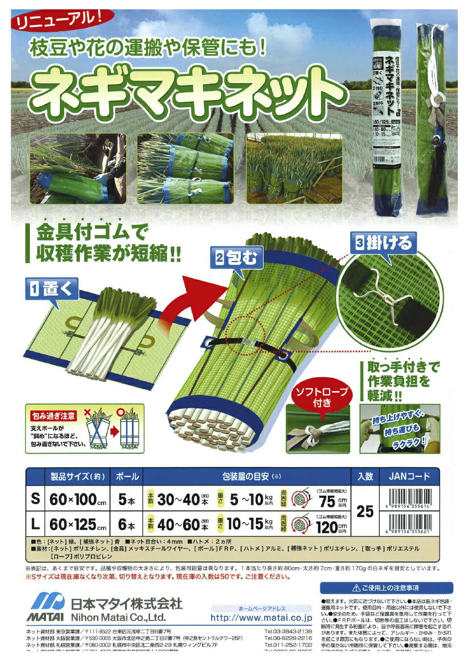 【仕様】 メーカー名:日本マタイ 商品名:ネギマキネット サイズ:L(60×125cm) ポール:6本 包装量の目安:本数/40~60本、重さ/10~15kg ※【沖縄・離島】へ発送する場合は別途送料が必要となります。 ※モニターの発色具合によって実際のものと色が異なる場合があります。 ※製品の各仕様・デザイン・価格等については、改良のため予告なく変更される場合があります。