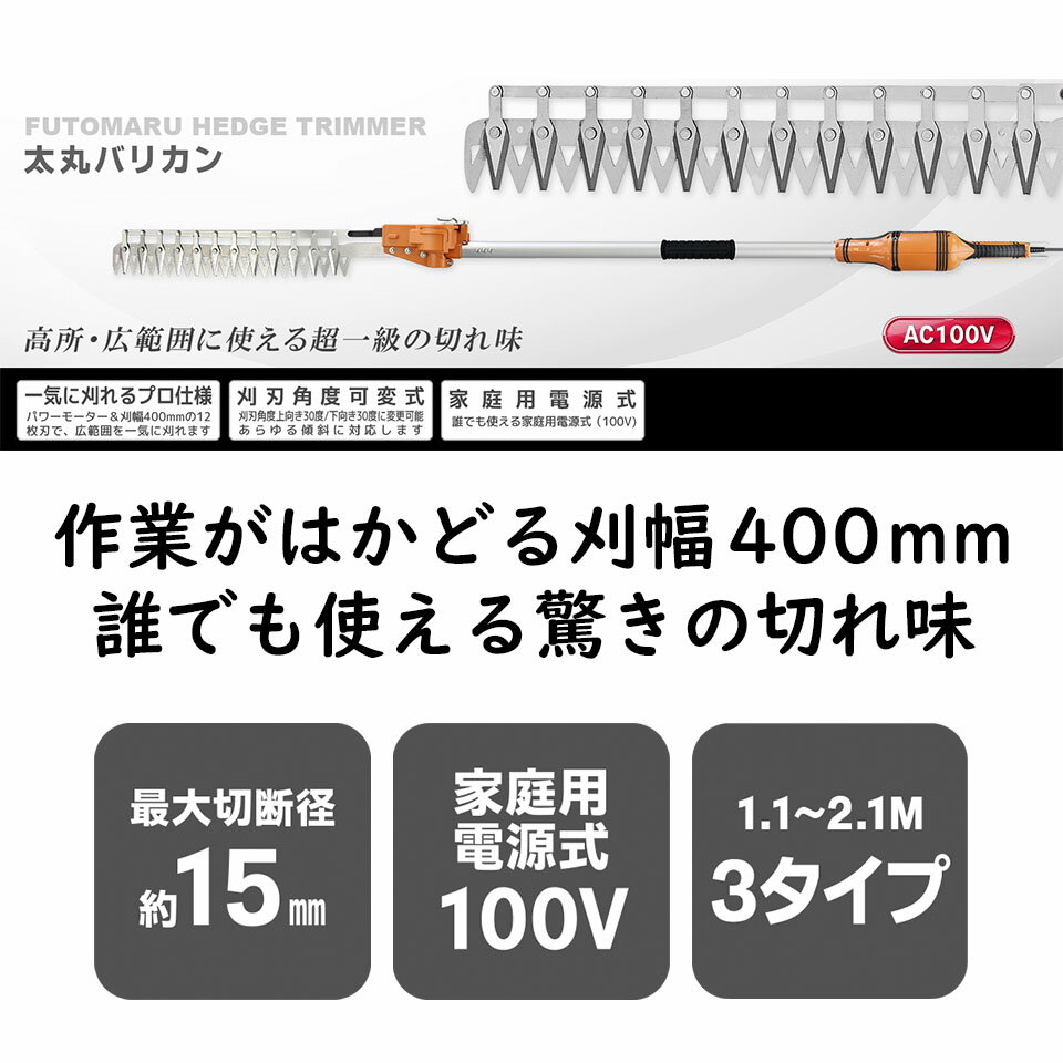 ニシガキ工業 太丸バリカン 高枝 生垣 植木 ヘッジトリマ 剪定 太枝 刈込 玉造り 電動式 AC100V 400mm 片刃ハサミ式 1.1m 1.6m 2.1m N-960 N-961 N-962 コンセント 送料無料