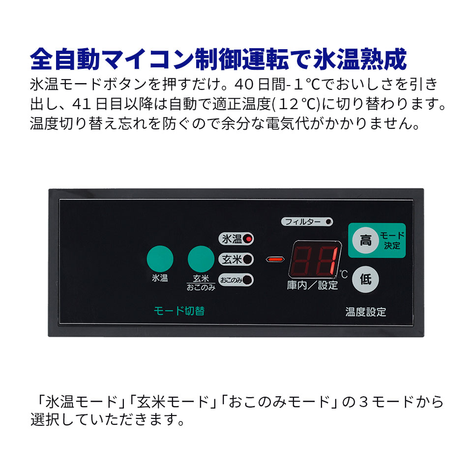 【商品の特徴】 ・自宅で氷温米が作れる!収穫したお米の甘味が増しおいしささらにアップ!! ・冷めてもお米がパサつかず、再熟成で旨みが回復します ・シンプルで見やすい大型操作パネルを採用! ・庫内設定温度-5℃~15℃まで設定可能! (※加温機能はございません。) ・大容量8段積みで設置スペースはそのまま、収納力アップ! ・大型取手を採用することで開け閉めが楽になりました ・お年寄りでも安心!当社経費負担で指定の場所に搬入、据え付けも行います ・安心サービス体制、全国200ヶ所のサービス拠点よりフォローします ・冷却装置は5年保障付(本体1年) 【仕様】 (EWH-16) ・仕様タイプ:8俵タイプ/16袋用(玄米30kg) ・最大外寸法:W900×D870×H2062~2082mm ・庫内有効寸法:W798×D650×H1590mm ・質量:107kg ・電源:単相100V ・必要搬入口寸法:W1000×H2100mm ・消費電力/冷却時:239/268 ・冷媒:HFC R134a (EWH-24) ・仕様タイプ:12俵タイプ/24袋用(玄米30kg) ・最大外寸法:W1500×D870×H2062~2082mm ・庫内有効寸法:W1398×D650×H1590mm ・質量:147kg ・電源:単相100V ・必要搬入口寸法:W1000×H2100mm ・消費電力/冷却時:268/297 ・冷媒:HFC R134a (EWH-32) ・仕様タイプ:16俵タイプ/32袋用(玄米30kg) ・最大外寸法:W1530×D1020×H2062~2082mm ・庫内有効寸法:W1428×D800×H1591mm ・質量:186kg ・電源:単相100V ・必要搬入口寸法:W1100×H2100mm ・消費電力/冷却時:406/437 ・冷媒:HFC R404a (EWH-40) ・仕様タイプ:20俵タイプ/40袋用(玄米30kg) ・最大外寸法:W1800×D1020×H2062~2082mm ・庫内有効寸法:W1694×D800×H1589mm ・質量:235kg ・電源:単相100V ・必要搬入口寸法:W1100×H2100mm ・消費電力/冷却時:411/442 ・冷媒:HFC R404a 【オプション棚仕様】 (MET900T) ・・適用機種:EWH16 ・棚板サイズ:幅730×奥410mm ・耐荷重:60kg/1枚 ・付属品:棚板/1枚、フック/4個、棚柱/4本、ネジ/12ヶ (MET1500T) ・適用機種:EWH24 ・棚板サイズ:幅1,330×奥410mm ・耐荷重:60kg/1枚 ・付属品:棚板/1枚、フック/4個、棚柱/4本、ネジ/12ヶ (MET1500DT) ・適用機種:EWH32 ・棚板サイズ:幅1,365×奥660mm ・耐荷重:60kg/1枚 ・付属品:棚板/1枚、フック/6個、棚柱/6本、ネジ/18ヶ (MET1800DT) ・適用機種:EWH40 ・棚板サイズ:幅1,630×奥660mm ・耐荷重:60kg/1枚 ・付属品:棚板/1枚、フック/6個、棚柱/6本、ネジ/18ヶ ※【北海道・沖縄・離島】へは別途設置費が必要となります。 ※地域によっては設置が出来ない地域がございます。 ※受注生産により納品までに2ヶ月程度を要します。 ※モニターの発色具合によって実際のものと色が異なる場合があります。 ※製品の各仕様・デザイン・価格等については、改良のため予告なく変更される場合があります。