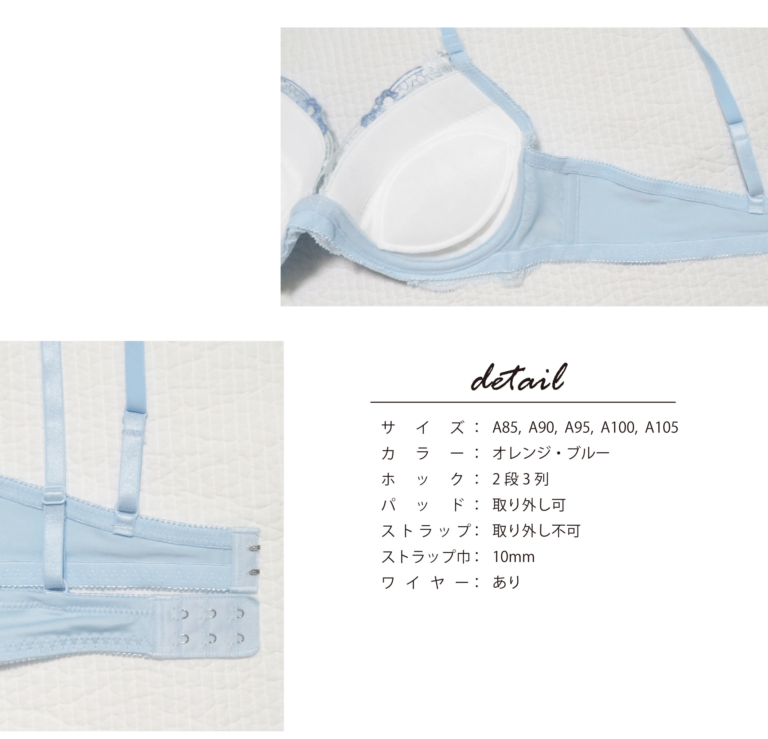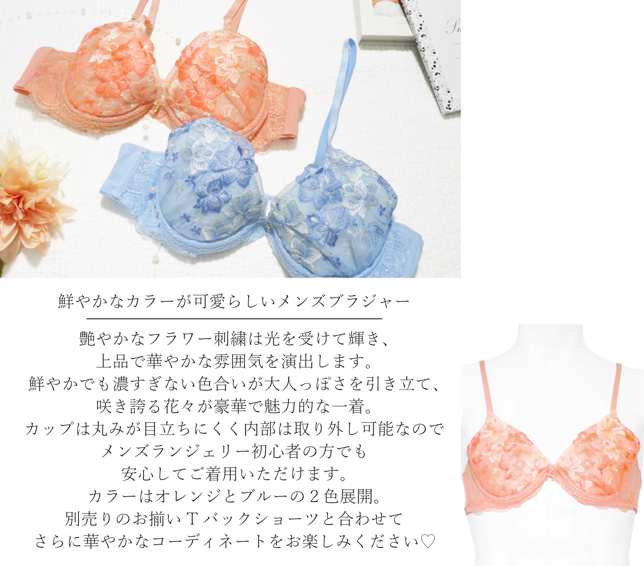 男ブラ メンズブラ 男性用ブラ メンズブラ 男性用ブラ 大きいサイズ 男性用ブラジャー 下着 ブラ 男性用下着 かわいい▼ お揃いのショーツはこちら ▼ ▼ こちらもおすすめ ▼ 鮮やかなカラーが胸元を彩り、可愛らしく目を引くブラジャー。 艶やかなフラワー刺繍は光を受けて輝き、上品で華やかな雰囲気を演出します。 鮮やかでも濃すぎない色合いが大人っぽさを引き立て、咲き誇る花々が豪華で魅力的な一着。 カップは丸みが目立ちにくく、内部は取り外し可能なのでメンズランジェリー初心者の方でも安心してご着用いただけます。 カラーはオレンジとブルーの2色展開。 別売りのお揃いTバックショーツと合わせれば、より華やかなコーディネートが楽しめます。 商品名(商品番号): 男性用ブラジャー フラワー レース 鮮やか A85-A105 メンズ体型用 パッド入り (JM-7043-B)[メール便不可]【 男ブラ メンズブラ 大きいサイズ 下着 ブラ トランスジェンダー 女装 コスプレ 乙女男子 かわいい】 カラー: ・オレンジ・ブルー サイズ: A85 A90 A100 A105 A85 アンダーバスト:85cm・バスト:95cm A90 アンダーバスト:90cm・バスト:100cm A95 アンダーバスト:95cm・バスト:105cm A100 アンダーバスト:100cm・バスト:110cm A105 アンダーバスト:105cm・バスト:115cm ホック: 2段3列 パッド: あり(取り外し可) ストラップ: 取り外し不可 生地の透け感: 前面アンダー部あり ワイヤー: あり セット内容: ブラジャー単品 素材: 【ブラ】ポリエステル・ナイロン・その他 【関連キーワード】 男ブラ メンズブラ 男性用ブラ メンズブラ 男性用ブラ 大きいサイズ 男性用ブラジャー 下着 ブラ 男性用下着 かわいい