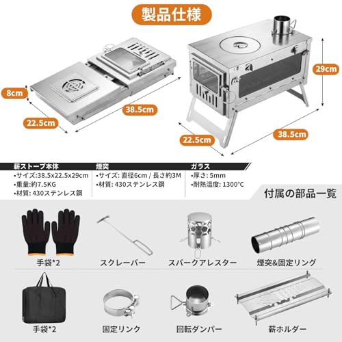 シルバー/-/dhzdl-fanxin・薪ストーブ・製品仕様展開サイズ:約L38.5cm×W22.5cm×H29cm (煙突300cm); 収納サイズ:約L38.5cm×W22.5cm×H8cm;材質:本体・煙突:ステンレス鋼;本体重量:約7.5kg;対応可能な薪長さ:35cm以下。・圧倒的な燃焼効率の高さこちらのウッドストーブは少ない燃料で高火力、煙や灰が少ない二次燃焼構造を採用しています。ウッドストーブの二次燃焼により、大きな火力になるだけでなく、また、ウッドストーブには灰受けがあるため、薪が完全燃焼しやすく、灰が残りにくいです。キャンプストーブの片付けの手間を減らしてくれます。・耐熱ガラス安全・安心キャンプストーブには耐熱ガラス二箇所あるので、いつでも火加減を一目瞭然です。ストーブ内火が燃える様子を眺めて、心も落ち着きます。真冬のキャンプでも快適に過ごせる程度の暖かさがあります。温かみのある雰囲気を演出します。暖を取るだけでは、天板の丸蓋を取り外すと、火を使って、直接に調理器具としてもご使用頂けます。・持ち運びしやすいコンパクトサイズ薪ストーブ本体暮らしに寄り添い、家族や友人との穏やかで楽しい時間を届けてくれます 薪ストーブは暮らしをぐっと豊かにするために欠かせない道具。 冬でもキャンプを楽しみたいけど、寒さがネックで諦めていませんか? 薪ストーブがあればテントの中でぬくぬく温まりながら、のんびりと炎を眺められますよ。 真冬のキャンプでも快適に過ごせる程度の暖かさです。 寒さに悩まされることなく、自然のなかで思い切りアウトドアを楽しめるでしょう。 暖房性と、積み込みやすさを両立 ?本体の大きさは約37cm×19.5cm×24.5cmと平均的な薪ストーブのサイズ。形状はボックス型で、発熱部がそこそこ大きいので、冬の山でも過ごせるレベルの暖房性を備えているといえます。 ?ダンパーが付属しているため、温度が上がってきた際にはダンパーを閉めて、温度調節できるところも魅力でしょう。 ?総重量は7kgと、1人で車に積み込める重さ。収納時のサイズは荷室を圧迫するほどの大きさではないため、コンパクトで持ち運びやすいです。 ?また、収納袋がついているところもうれしいポイントです。 二次燃焼で燃焼効率も高く焚火で大活躍 薪ストーブは少ない燃料で高火力、煙や灰が少ない二次燃焼構造を採用しているので、灰受けもあり、薪が完全燃焼しやすく、灰が残りにくいこともメリットでしょう。 煙突の高さは2.5mと高く、テント内に入れても煙突の長さを1m以上確保できるので、テントに火の粉が落ちることが少ないです。 厳冬期でも問題なく過ごせる程度の暖房性の高さと、1人で車に乗せられる軽さを両立。準備・片づけが簡単なうえに、使用中に便利なダンパーも搭載しており、おすすめできる薪スーブです。 製品仕様 ●素材:ステンレス鋼、耐熱ガラス ●使用時:(約)L38.5cm×W22.5cm×H29cm (煙突300cm) ●収納時:(約)L34cm×W19.5cm×H8cm ●重量:約7.5KG