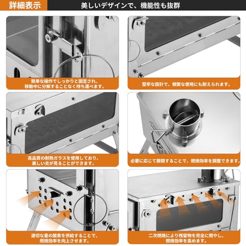 SENQI 薪ストーブ 二次燃焼 キャンプ用 焚き火ストーブ 2面ガラス窓 煙突3メートル キャンプ 調理器具 クッキングストーブ 折りたたみス