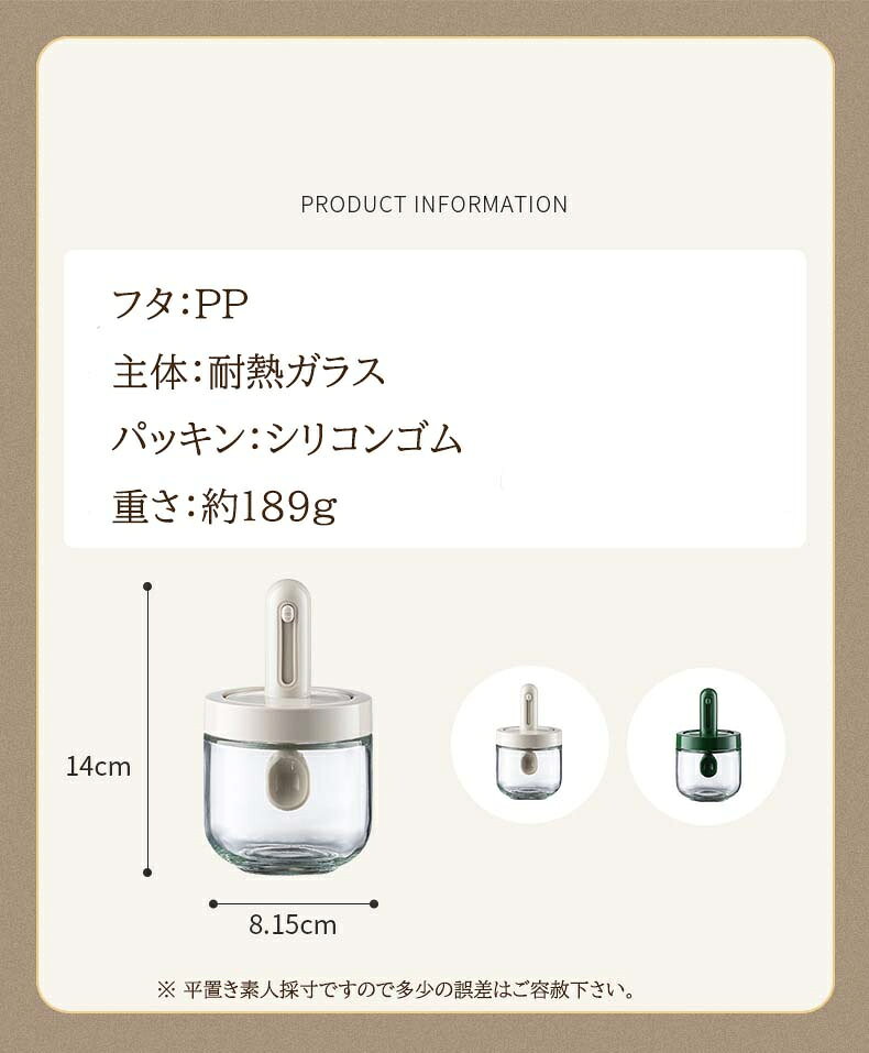 【商品番号】y758255 【カラー】ホワイト2個、グリーン2個、ホワイト1個+グリーン1個、ホワイト3個、グリーン3個、ホワイト4個、グリーン4個 調節可能なスポーン付き フタと一体になる、伸縮で長さを調節できるスプーン付き。調味料が満杯になっても気楽に蓋を閉めます。一番下まで届きますので調味料を使い切ることができます。 幅広い用途 調味料ボトル、塩、コショウ、砂糖、生姜、シナモン、黄キャベツ、ニンジンなどのスパイスやパウダーケーキとして使用できます。ご家庭やレストランに最適です。 注意事項: ※ 平置き素人採寸ですので多少の誤差はご容赦下さい。 ※ モニタ環境によって、商品の色合いが多少違う場合があります。 ※ 少々匂いがありますが、置いたままで2-3日くらいになくなりますので、ご安心ください。 ※ 発送時も簡易梱包の為、お受け取り時にたたみ皺が有ると思いますが、ご了承ください。