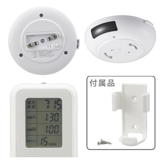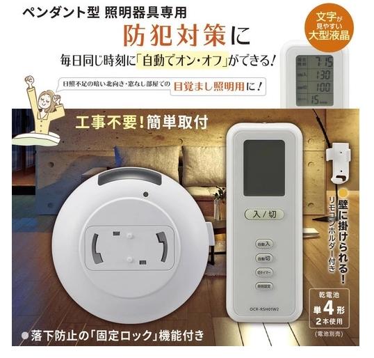 商品情報商品説明≪受信機本体≫■ 入力:AC100V 50Hz/60Hz■ 定格容量:3A■ 外形寸法:(約)直径100×高さ42mm■ 質 量:約100g≪リモコン≫■ 使用電池:単4形乾電池×2本(別売)■ 有効距離:約5m (障害物のない場合)■ 質 量:タイマーなし約33g(乾電池除く) タイマーあり約55g(乾電池除く)■ タイマーあり: リモコンホルダー・ネジ×2本・保証書付取扱説明書生産地:中国注意事項※ 5kg以上の照明器具に使用しないでください。※ 5kgを超える照明器具の場合、チェーンなどを使用してください。(照明器具の落下によるけがの原因 になります。)※ 定格容量3A以下の照明器具を使用してください。(容量目安 :蛍光灯・電球形蛍光灯の場合…150Wまで 、白熱灯の場合…300Wまで 、インバーター照明器具の場合…120Wまで ※容量を超えると、故障や発火の原因となります。)※ タイマー付製品のほうの、自動入・自動切・切タイマー設定後の使用時においては、リモコンの送信部を本体の受信部に向けて置いておく必要があります。ご注意※メーカーの都合により予告なくパッケージ、内容等が変更となる場合がございます。※それにともなう返品、返金等は受け付けておりませんのでご了承のうえお買い求めください。【売れ筋】OHM 新型 ペンダント型 照明器具専用 リモコンスイッチ タイマー機能あり 防犯対策 オーム電機 OCR-RSH01W2 JAN/4971275787803 【年中無休/人気商品】RY 照明リモコン後付 ● 文字が見やすい大型液晶リモコン● 毎日同じ時刻に繰り返し「自動オン・オフ」も可能、防犯対策に● 5時間後まで自動オフができる切タイマー機能付き● 使用できる照明器具(天井引掛けシーリング使用の照明器具)・ 洋風・和風ペンダントライト・ シャンデリア・ 引掛けソケット使用の電球・ 小型シーリングライト(直径30cm以下)● 使用できない照明器具・ 天井直付タイプの大型シーリングライト 10