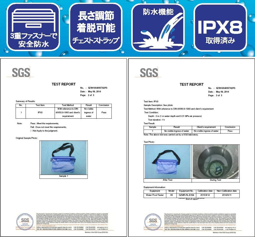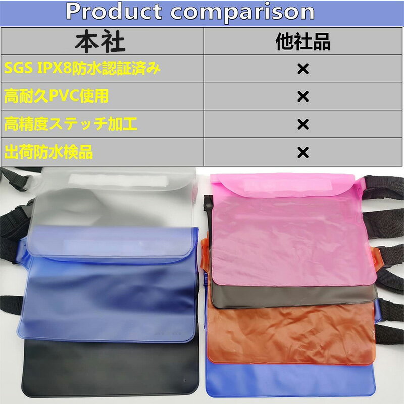 海やプール、アウトドアやフェスで大活躍! 貴重品やよく使うものをまとめて持ち運べる便利な防水バッグ。 あなたが楽しい時間を過ごしている間、水や汚れからしっかりとガードします。 見た目以上にたっぷり入る収納力!スマホや財布(二つ折り)・鍵などの貴重品の他に タバコや眼鏡なども!外出時の必須アイテムを全てまとめることができます。 ベルトの長さは約57〜90cmまで調整でき、 全 9 色、好みのスタイルでオシャレに持ち運ぶ事が可能です。ベルトはバックル式で着脱も簡単♪ 【完全防水】防水レベル高水準なので、3段チャックで連続的に水没しても内部には水が侵入できません。防水性が非常に優れた密封式防水バッグ!貴重品やよく使うものをまとめて持ち運べる便利な防水バッグ。梅雨時期にも大きな役割を果たすことができます。 【4way】調整可能な超長いウエストベルトが含まれています。ベルトはバックル式で着脱も簡単!ベルトの長さは約57〜90cmまで調整でき、「ショルダーバッグ」・「ボディバッグ」・「ハンドバッグ」・「ウエストバッグ」など、お好みのスタイルでオシャレに持ち運ぶ事が可能です。 【大容量】コンパクトに見えても、見た目以上の収納力!iphone、ipad mini、スマホ、デジカメラ、鍵、財布(二つ折り)、ハンカチ、タバコ、眼鏡など同時に収納でき、外出時、プールや海での貴重品管理にも、是非お使いください。【タッチ操作可能】防水ケースとは思えない薄さ、防水ケースを付けたままタッチ操作OK! 【オススメ】マリンスポーツをはじめ、釣り、登山など、いわゆるレジャー活動はもちろん、普段使いのバッグとしても、様々なシーンに便利にお使い頂けます。